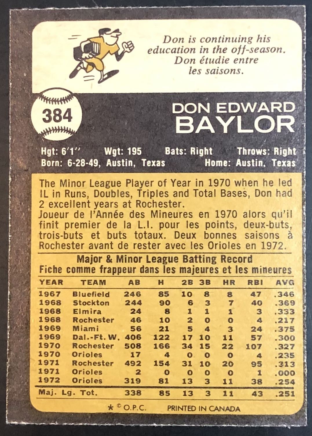 Card #384 MLB, baseball, vintage, OPC, rookie
