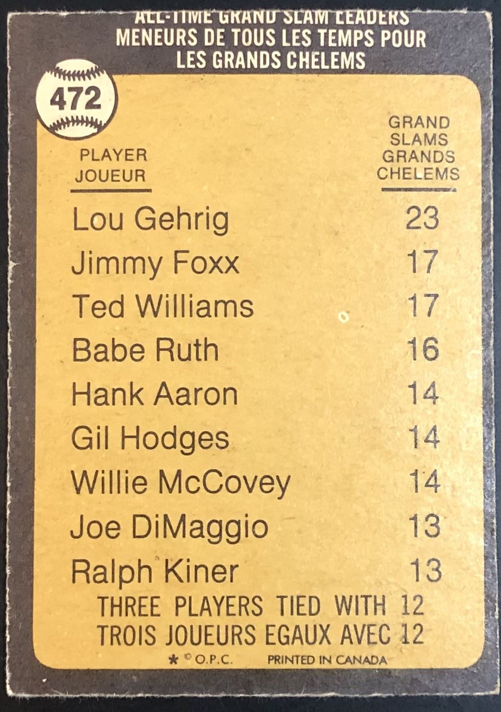 Card #472 MLB, baseball, vintage, OPC, hall of fame