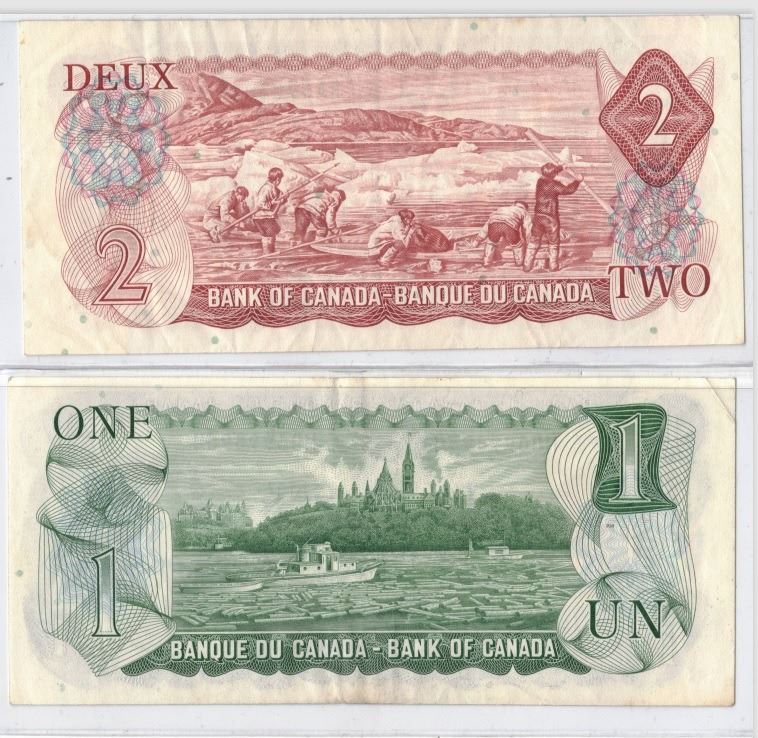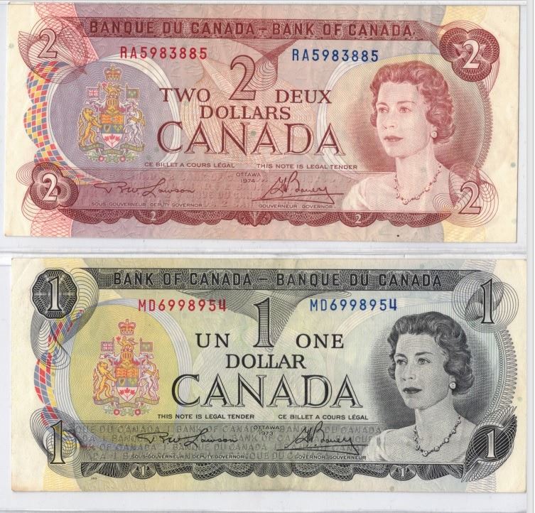 1973 One Dollar Bill and 1974 Two Dollar Bill , Bank Notes, Crisp, Bright Colours