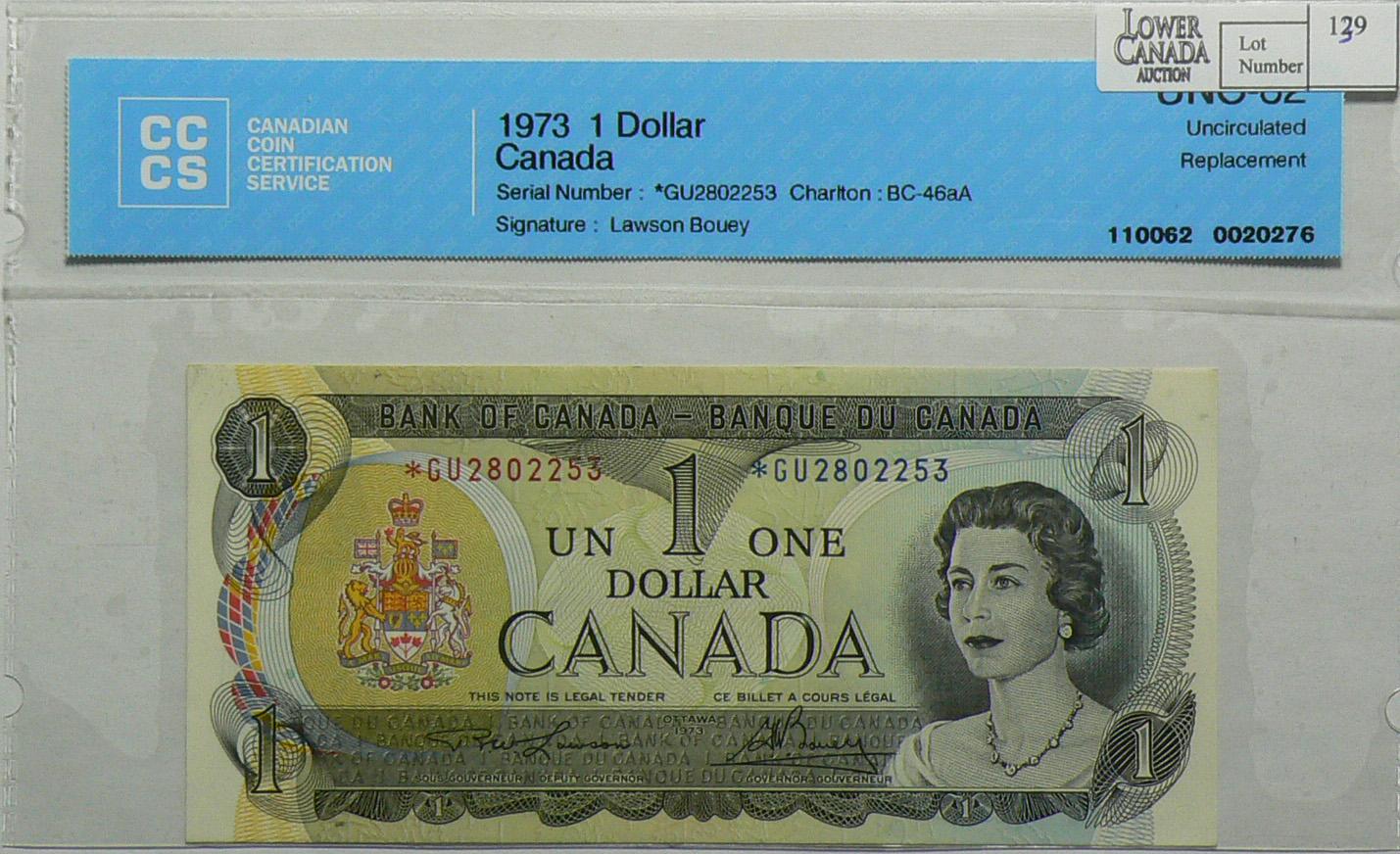 1973 One Dollar Replacement, BC-46aA, CCCS UNC-62, Lawson Bouey, serial *GU2802253.