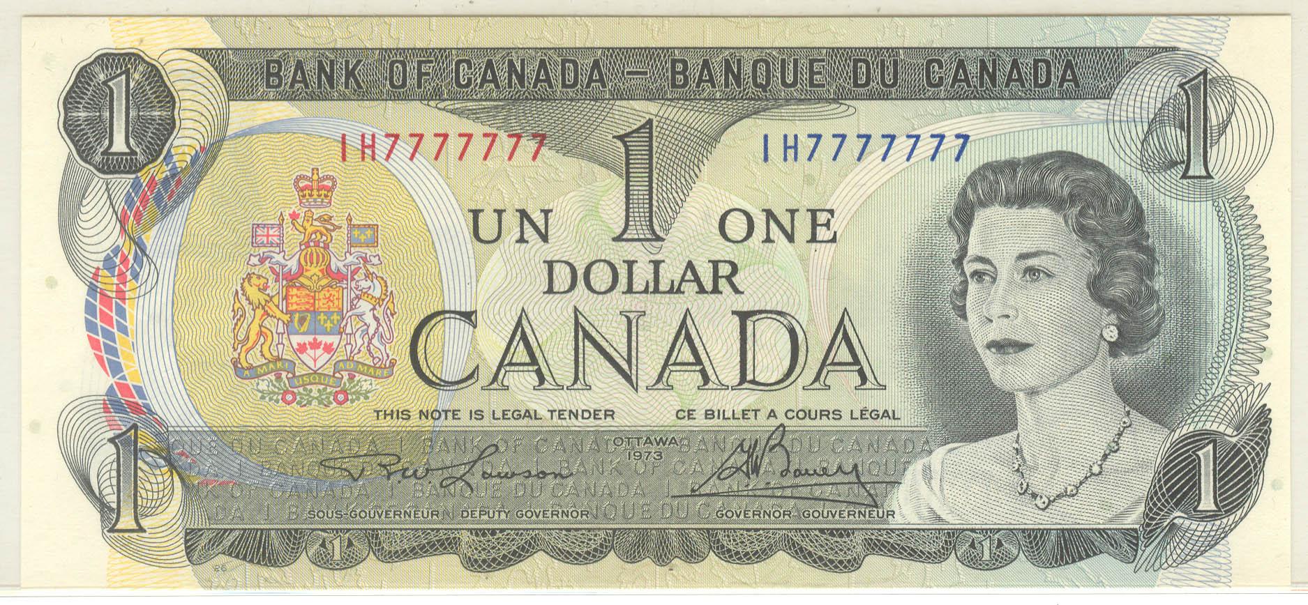 1973 One Dollars Solid Radar, BC-46a, AU/UNC, Lawson Bouey, serial IH7777777.