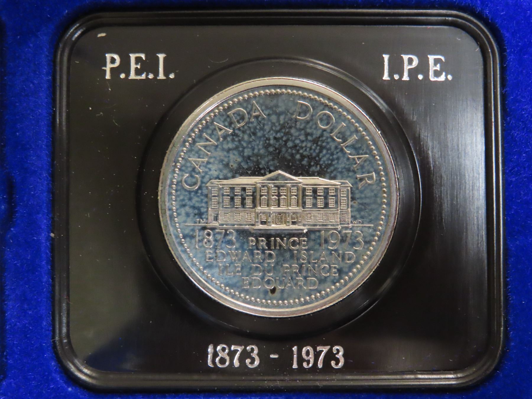 1973 PEI Centennial Specimen Nickel Dollar. Housed in its original blue clamshell case of issue.