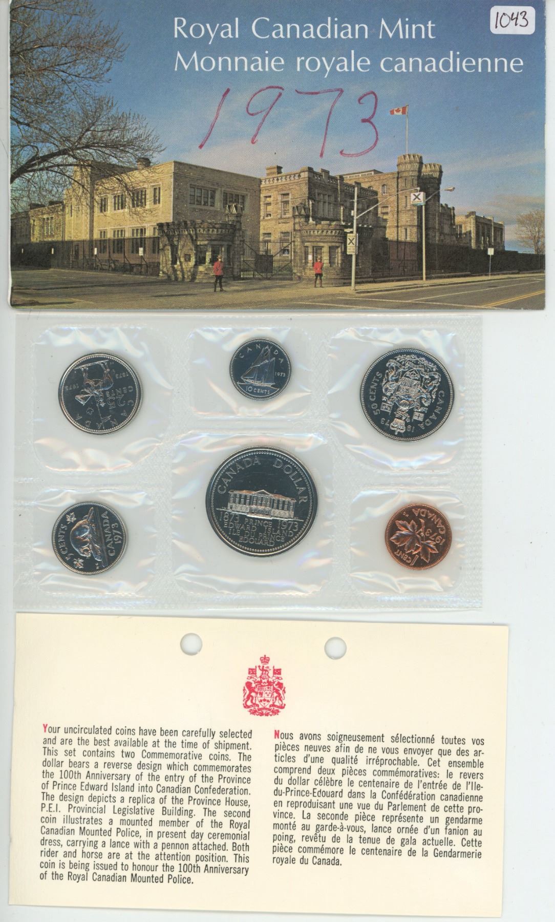 1973 Proof Like Set. 6-coin set includes RCMP Centennial 25 Cents & PEI Centennial Nickel Dollar.