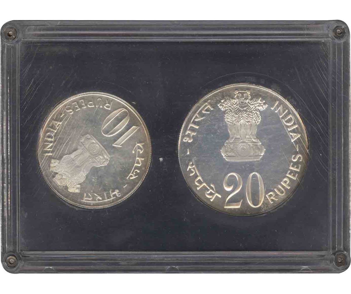 1973,ProofSet,Grow More Food,20 Rupees and 10 Rupees,Bombay Mint,(RB # 37),intact condition of the certificate and cover with acrylic case, Rare.