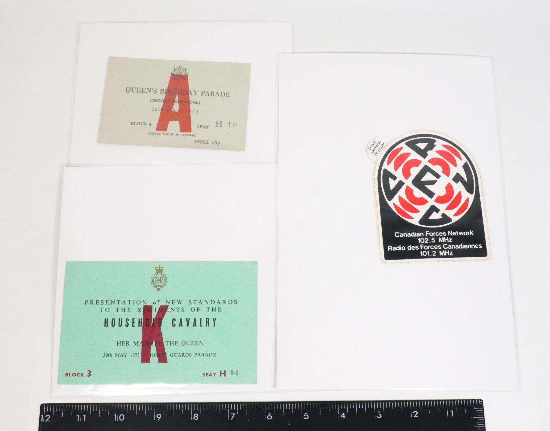 DOCUMENT TICKET EPHEMERA BRITISH MILITARY QEII, 1973 QUEEN ELIZABETH II BIRTHDAY PARADE DOCUMENT TICKET EPHEMERA BRITISH MILITARY QEII AND CANADIAN FORCES NETWORK RADIO STICKER CANADA MILITARY EPHEMERA