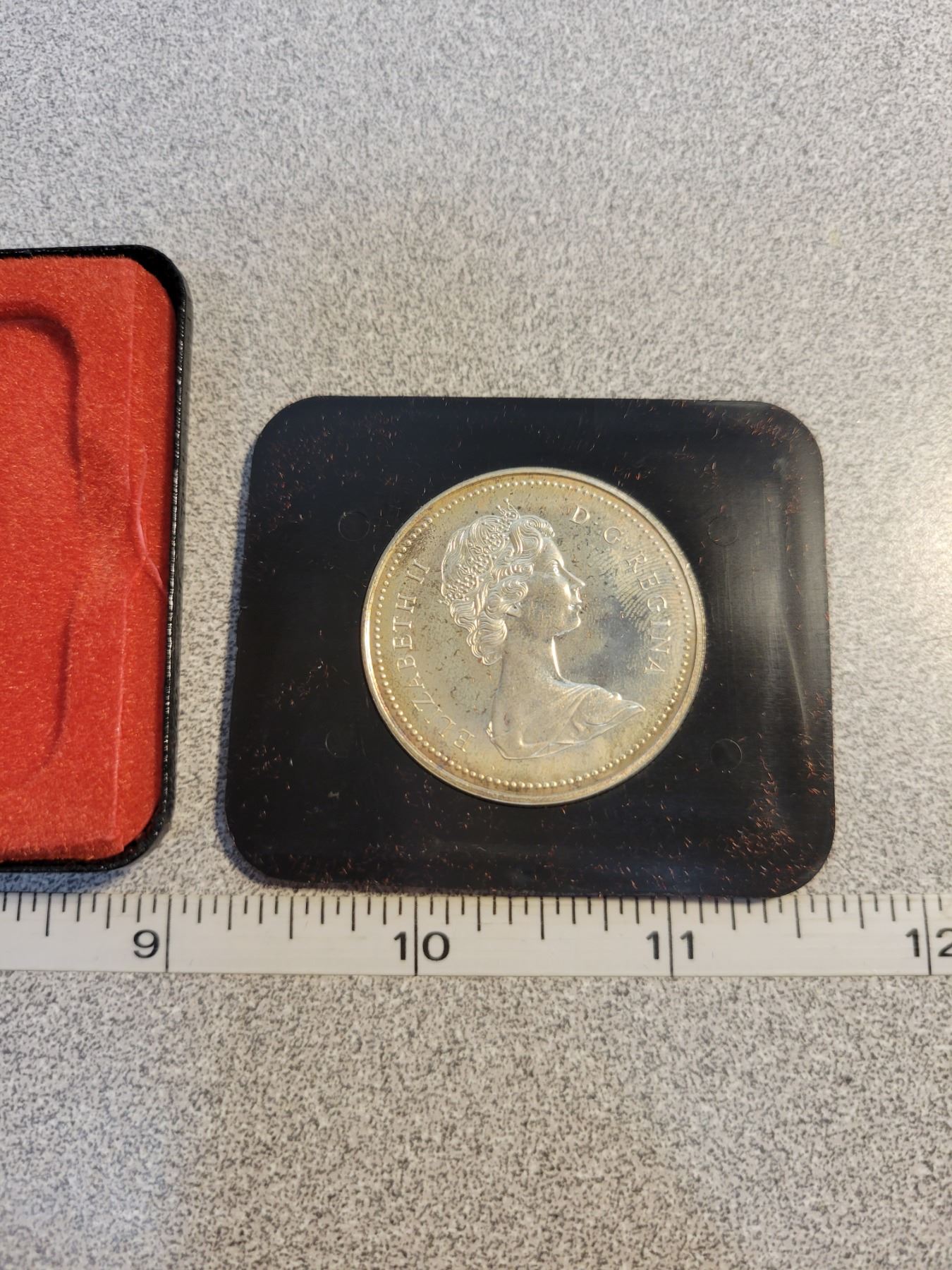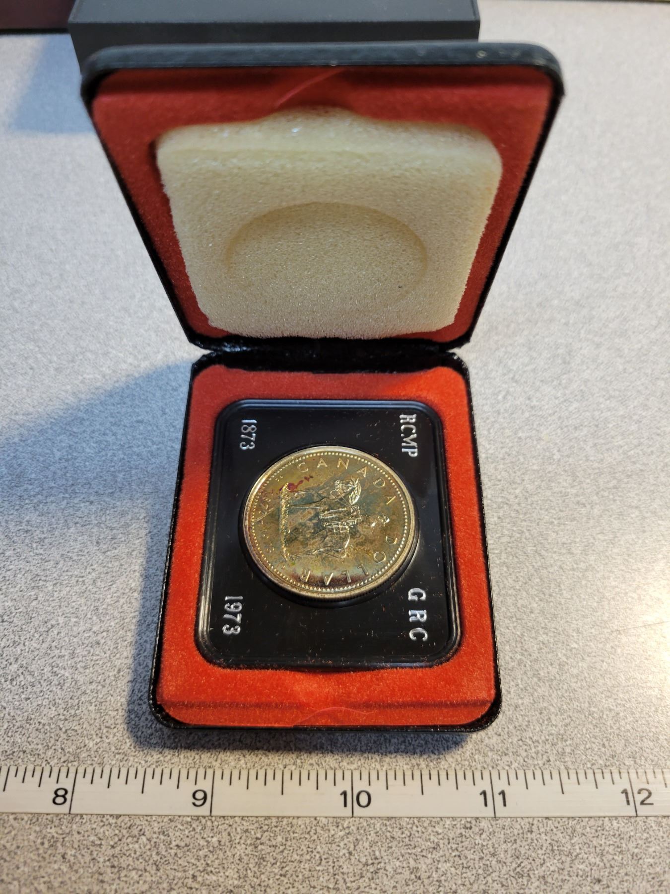 1973 RCMP Centennial Silver Dollar. Specimen. Nicely Toned. Housed in its original black clamshell case of issue.