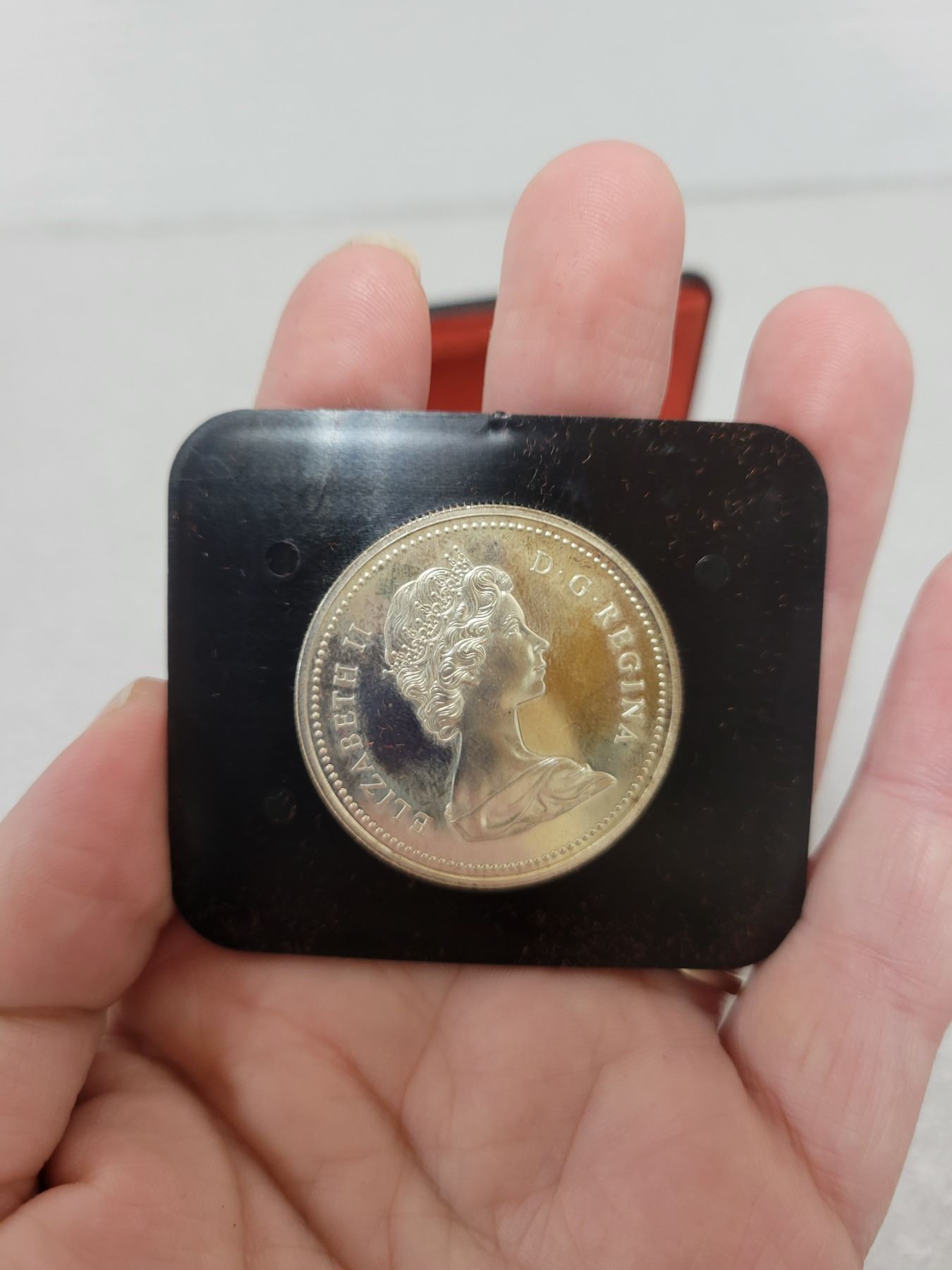 1973 RCMP Centennial Silver Dollar. Specimen. Nicely Toned. Housed in its original black clamshell case of issue.