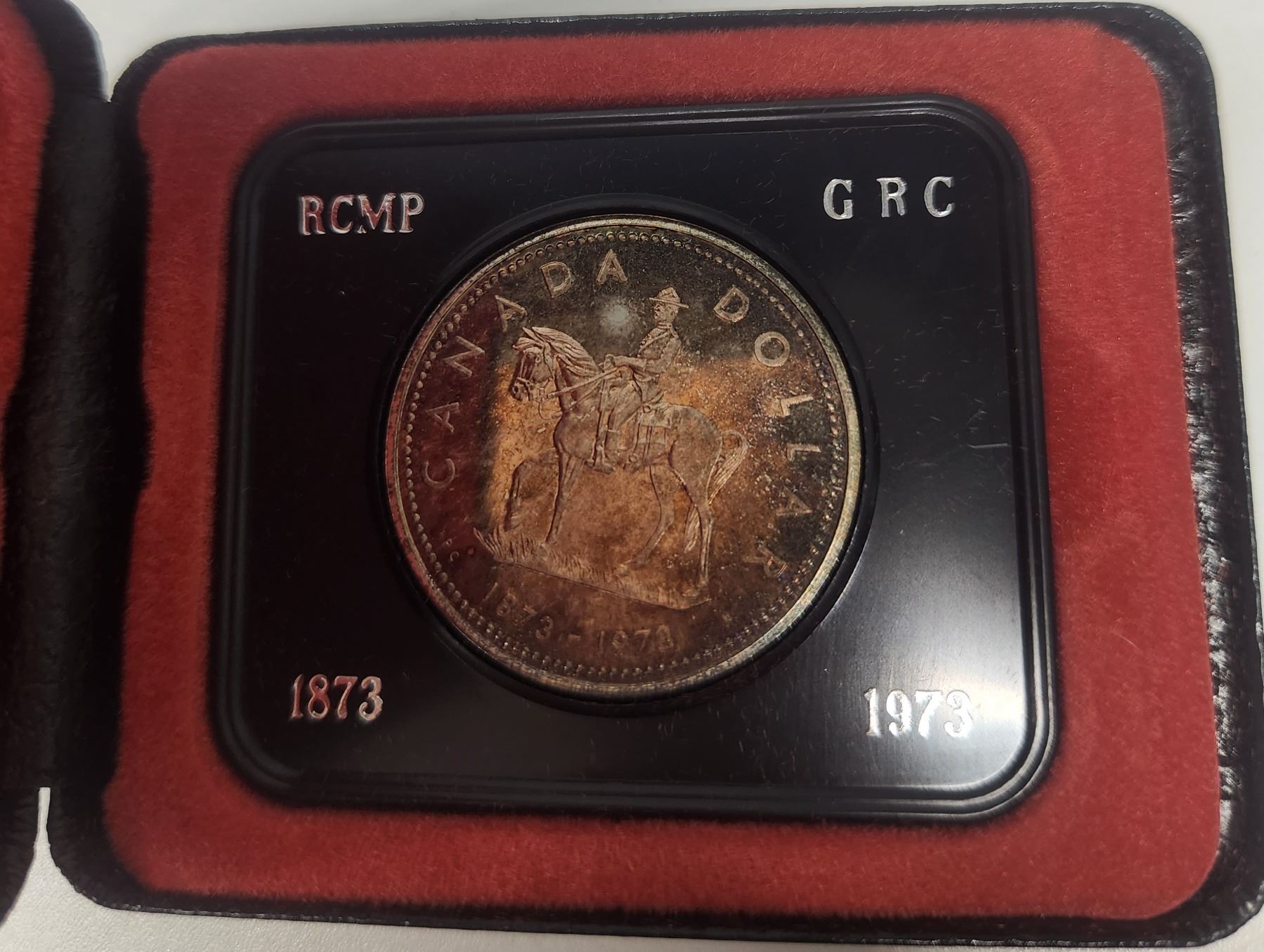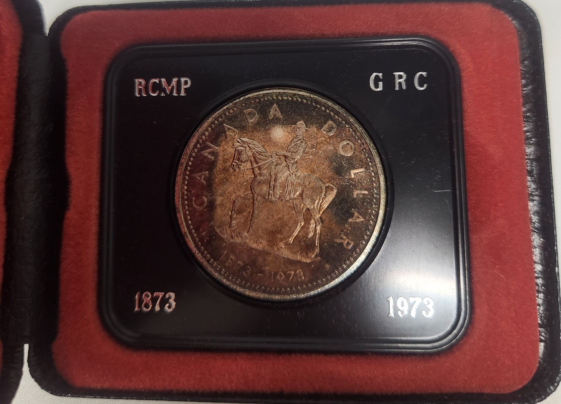 1973 RCMP Specimen Silver Dollar. Commemorates the 100th Anniversary of the founding of the North West Mounted Police. Beautifully Toned. In black clamshell case of issue.