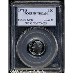 <B>1973-S<10C> PR70 Deep Cameo PCGS.</B></I> A superb proof cameo with essentially unimprovable surfaces that are virtually tone-free. Population: 7 in 70 (3/04). <BR><BR><B>Important notice:</B> Heritage usually auctions material at the rate of 200-250 lots per hour. On some occasions eBay Live bid software or the Internet may not be able to keep up with the pace of the auction. We recommend placing a realistic absentee bid now as insurance to avoid disappointment. Occasionally the auctioneer may eliminate or reject an eBay Live bid, and the auctioneer may also reopen a lot after the close of the eBay live bidding (usually because we missed an audience bid), and may reject your bid even if it shows you as the winning bidder. By bidding via eBay Live, you agree that Heritage may award the lot to another bidder at its sole discretion under the circumstances described above or any other reasonable circumstances. Since eBay bids are not shown to us until we open the lot on the floor, we treat those bids just like floor bids. In most cases the floor responds before the eBay bid is presented to us, due to Internet lag time, so for consistency we have made it a policy that floor bids are always considered first over tie eBay live bids. Also please note that all Heritage lots purchased through eBay Live carry a 20% Buyer's Premium. Please make sure you read the Terms and Conditions before you bid. </span></font></tr></table></td></tr></table>