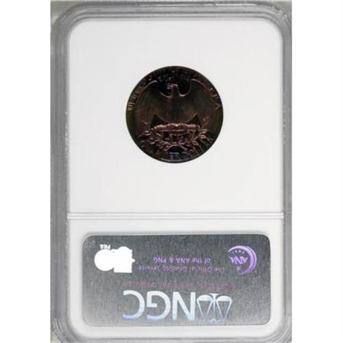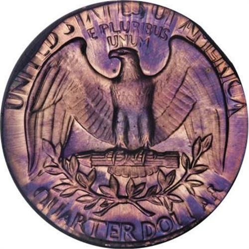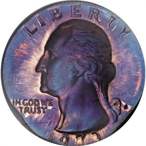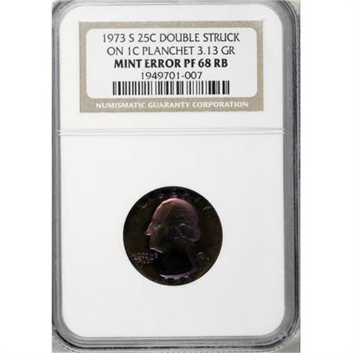<B>1973-S 25C Quarter--Double Struck on a Cent Planchet--PR68 Red and Brown NGC.</B></I> 3.13 gm. One of the most strikingly toned errors of the sale, with electric blue, violet, and orange shadings that mingle on each side. The high pressure used on proof coinage has caused this beautifully preserved planchet to spread to cover nearly the entire quarter-sized surfaces, though a small void remains at the lower right obverse and corresponding area of the reverse.<BR><BR><B>Coin Engraver:</B> John Flanagan<BR><BR><b>Shipping:</b> Coins & Currency (<a target="_blank" href="http://www.heritageauctions.com/common/shipping.php">view shipping information</a>)