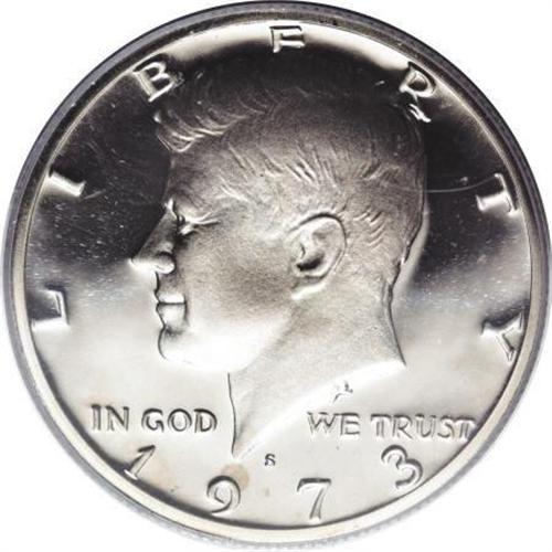 <B>1973-S 50C PR70 Deep Cameo PCGS.</B></I> Clad Kennedy half proofs get little respect--many later-date such pieces graded PR69DCAM are available for only a few dollars--so it may come as a surprise to collectors that some of the earliest clad proof issues are a far different story. PCGS has certified only 62 1971-S half dollars in PR69DCAM, with none in PR70DCAM. For 1972 there are 530 PR69DCAM pieces, but none in PR70DCAM. 1973 is the first year that PR70DCAM pieces exist, 17 to be precise, with nearly 4,000 pieces in PR69DCAM. A close examination of the surfaces expectedly fails to reveal even the most minute distraction, although bidders might appreciate the mention of a touch of gold color on the neck. A must-have acquisition for the Registry Set collector or investor. Population: 17 in 70 (10/07).<BR><I>From The Kallenberg #1 PCGS Registry Set Of Proof Half Dollars.</B></I><BR><BR><b>Shipping:</b> Coins & Currency (<a target="_blank" href="http://www.heritageauctions.com/common/shipping.php">view shipping information</a>)