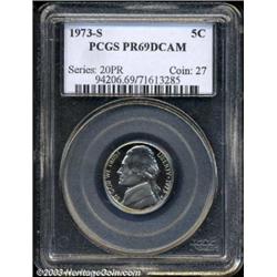 <TABLE cellSpacing=0 cellPadding=0 width="100%" bgColor=#000000 border=0><TBODY><TR><TD width="100%"><TABLE cellSpacing=1 cellPadding=3 width="100%" border=0><TBODY><TR><TD width="100%" bgColor=#79735c><FONT face=arial color=#ffffff size=3><B>Description</B> </FONT></TD></TR><TR><TD width="100%" bgColor=#ffffff><FONT face=arial size=2><B>1973-S 5C PR69 Deep Cameo PCGS.</B></I> The gorgeous lilac-gray fields are deeply reflective. Lightly toned devices contrast sharply against their dark backdrop. Seemingly mark-free and hairline-free, with an expectedly razor-sharp strike. Population: 32 in 69, 0 finer (8/03). </FONT></TD></TR></TBODY></TABLE></TD></TR></TBODY></TABLE><BR><A name=PricesRealized></A><TABLE cellSpacing=0 cellPadding=0 width="100%" bgColor=#000000 border=0><TBODY><TR><TD width="100%"><TABLE cellSpacing=1 cellPadding=3 width="100%" border=0><TBODY><TR><TD width="100%" bgColor=#79735c><A name=PR><FONT face=arial color=#ffffff size=3><B>Previous Prices from Heritage Auctions</B> </FONT></A></TD></TR><TR><TD bgColor=#f6f6ed><TABLE cellSpacing=0 cellPadding=0 width="100%" border=1><TBODY><TR><TD align=middle width="33%"><B>Date</B></TD><TD align=middle width="33%"><B>Service</B></TD><TD align=middle width="33%"><B>Price</B></TD></TR><TR bgColor=whitesmoke><TD width="33%"><B>08/12/2003</B></TD><TD width="33%">PCGS</TD><TD width="33%">$105.80</TD></TR><TR bgColor=whitesmoke><TD width="33%"><B>10/15/2002</B></TD><TD width="33%">NGC</TD><TD width="33%">$65.55</TD></TR></TBODY></TABLE></TD></TR><TR><TD bgColor=#ffffff><FONT face=arial size=1 ?>PLEASE NOTE: All prices realized reflect the final hammer price PLUS the buyer's premium in auctions that charge a buyer's premium. Each item has a notation at the top of the listing indicating whether that lot included a buyer's premium. Example: A item that sells with a final hammer price of $100 and a 20% buyer's premium will display with a price realized of $120. All information listed is intended to be as accurate as possible, but errors are possible. Please use this guide carefully and inform us of any inaccuracies. </FONT></TD></TR></TBODY></TABLE></TD></TR></TBODY></TABLE><BR><TABLE cellSpacing=0 cellPadding=0 width="100%" bgColor=#000000 border=0><TBODY><TR><TD width="100%"><TABLE cellSpacing=1 cellPadding=3 width="100%" border=0><TBODY><TR><TD width="100%" bgColor=#79735c colSpan=6><FONT face=arial color=#ffffff size=3><B>Price Guide*</B> </FONT></TD></TR><TR bgColor=#f6f6ed><TD align=middle><B>Grade</B> </TD><TD align=middle><B>Coin World<BR>(Trends)</B> </TD><TD align=middle><B>Numismedia<BR>Retail</B> </TD><TD align=middle><B>Numismedia<BR>Wholesale</B> </TD><TD align=middle><B>Coin<BR>Universe</B> </TD><TD align=middle><B>Heritage<BR>Value Index</B> </TD></TR><TR bgColor=#ffffff><TD align=middle>68</TD><TD align=right>---</TD><TD align=right>---</TD><TD align=right>---</TD><TD align=right>$50.00</TD><TD align=right>($1.00)</TD></TR><TR style="FONT-WEIGHT: bold" bgColor=#cccfdd><TD align=middle>69</TD><TD align=right>---</TD><TD align=right>---</TD><TD align=right>---</TD><TD align=right>$265.00</TD><TD align=right>($1.00)</TD></TR><TR bgColor=#ffffff><TD align=middle>70</TD><TD align=right>---</TD><TD align=right>---</TD><TD align=right>---</TD><TD align=right>---</TD><TD align=right>($1.00)</TD></TR><TR bgColor=#ffffff><TD colSpan=6><FONT size=1>*All information listed is intended to be as accurate as possible, but errors are possible. No item may be returned or refused based on this information which is provided as a service to our customers. You should contact each pricing source directly to determine the accuracy of this information. </FONT></TD></TR></TBODY></TABLE></TD></TR></TBODY></TABLE><BR><TABLE cellSpacing=0 cellPadding=0 width="100%" bgColor=#000000 border=0><TBODY><TR><TD width="100%"><TABLE cellSpacing=1 cellPadding=3 width="100%" border=0><TBODY><TR><TD width="100%" bgColor=#79735c><FONT face=arial color=#ffffff size=3><B>Population Guide</B> </FONT></TD></TR><TR bgColor=#ffffff><TD align=middle><!-- Begin Output of Population Grid--><TABLE cellSpacing=0 cellPadding=0 width="100%" border=0><TBODY><TR><TD vAlign=center><TABLE cellSpacing=0 width="100%" border=1 cellsadding="3"><TBODY><TR><TD vAlign=center><TABLE cellSpacing=0 cellPadding=3 width="100%" border=1><TBODY><TR><TD vAlign=center align=middle bgColor=#f0f1e8 colSpan=2 <CENTER><FONT face=Arial size=2><B>PCGS Pop </B></FONT><CENTER></CENTER></TD><TD vAlign=center align=middle bgColor=#f0f1e8 colSpan=2><CENTER><FONT face=Arial size=2><B>NGC Pop</B></CENTER></FONT></TD></TR><TR><TD vAlign=center><FONT face=Arial size=2>(69)</FONT> </TD><TD vAlign=center align=right><FONT face=Arial size=2>32</FONT> </TD><TD vAlign=center><FONT face=Arial size=2>(69)</FONT> </TD><TD vAlign=center align=right><FONT face=Arial size=2>11</FONT> </TD></TR><TR><TD vAlign=center><FONT face=Arial size=2>(>69)</FONT> </TD><TD vAlign=center align=right><FONT face=Arial size=2>0</FONT> </TD><TD vAlign=center><FONT face=Arial size=2>(>69)</FONT> </TD><TD vAlign=center align=right><FONT face=Arial size=2>0</FONT> </TD></TR></TBODY></TABLE></TD></TR></TBODY></TABLE></TD></TR></TBODY></TABLE><!-- End Output of Population Grid--> Important notice: Heritage usually auctions material at the rate of 200-250 lots per hour. On some occasions eBay Live bid software or the Internet may not be able to keep up with the pace of the auction. We recommend placing a realistic absentee bid now as insurance to avoid disappointment. Occasionally the auctioneer may eliminate or reject an eBay Live bid, and the auctioneer may also reopen a lot after the close of the eBay live bidding (usually because we missed an audience bid), and may reject your bid even if it shows you as the winning bidder. By bidding via eBay Live, you agree that Heritage may award the lot to another bidder at its sole discretion under the circumstances described above or any other reasonable circumstances. Also please note that all Herit