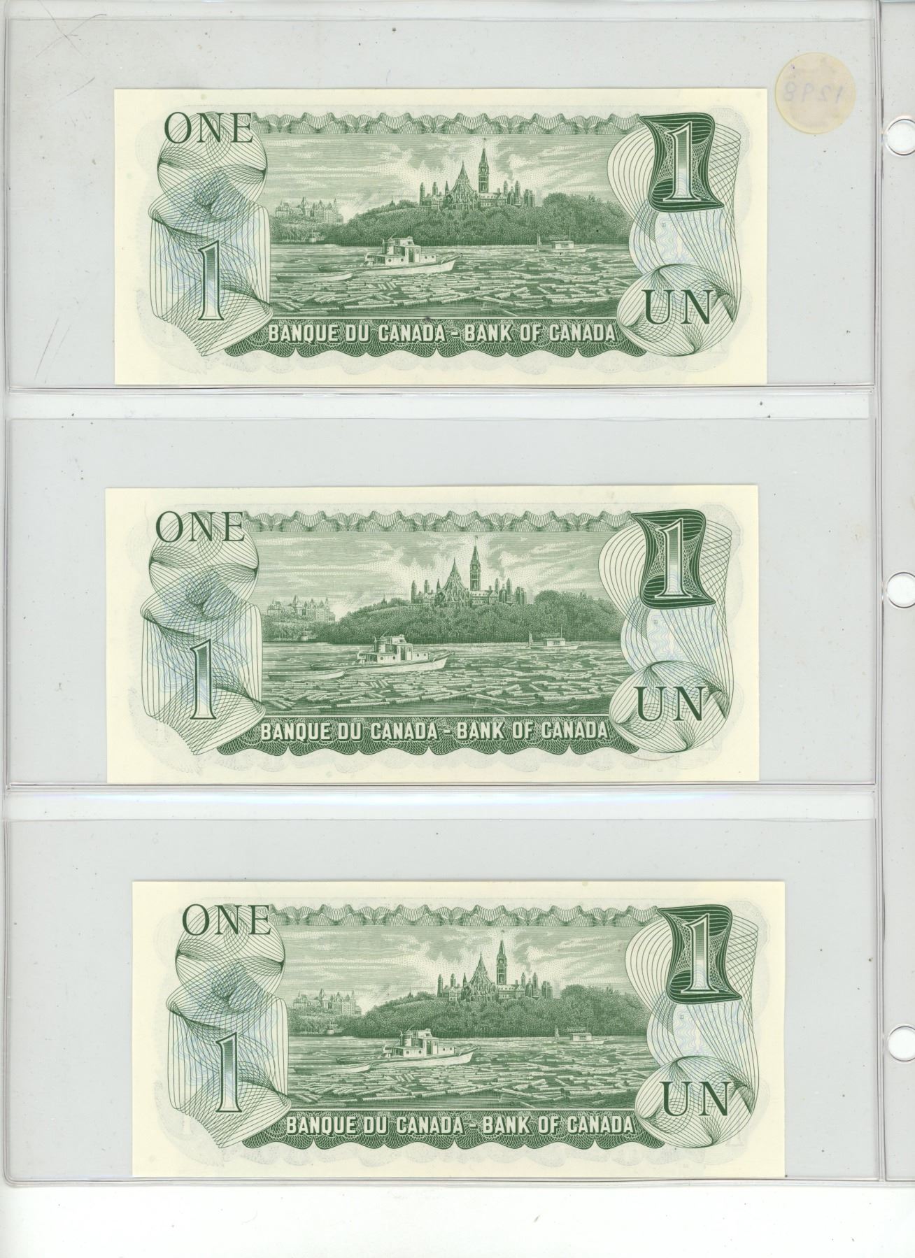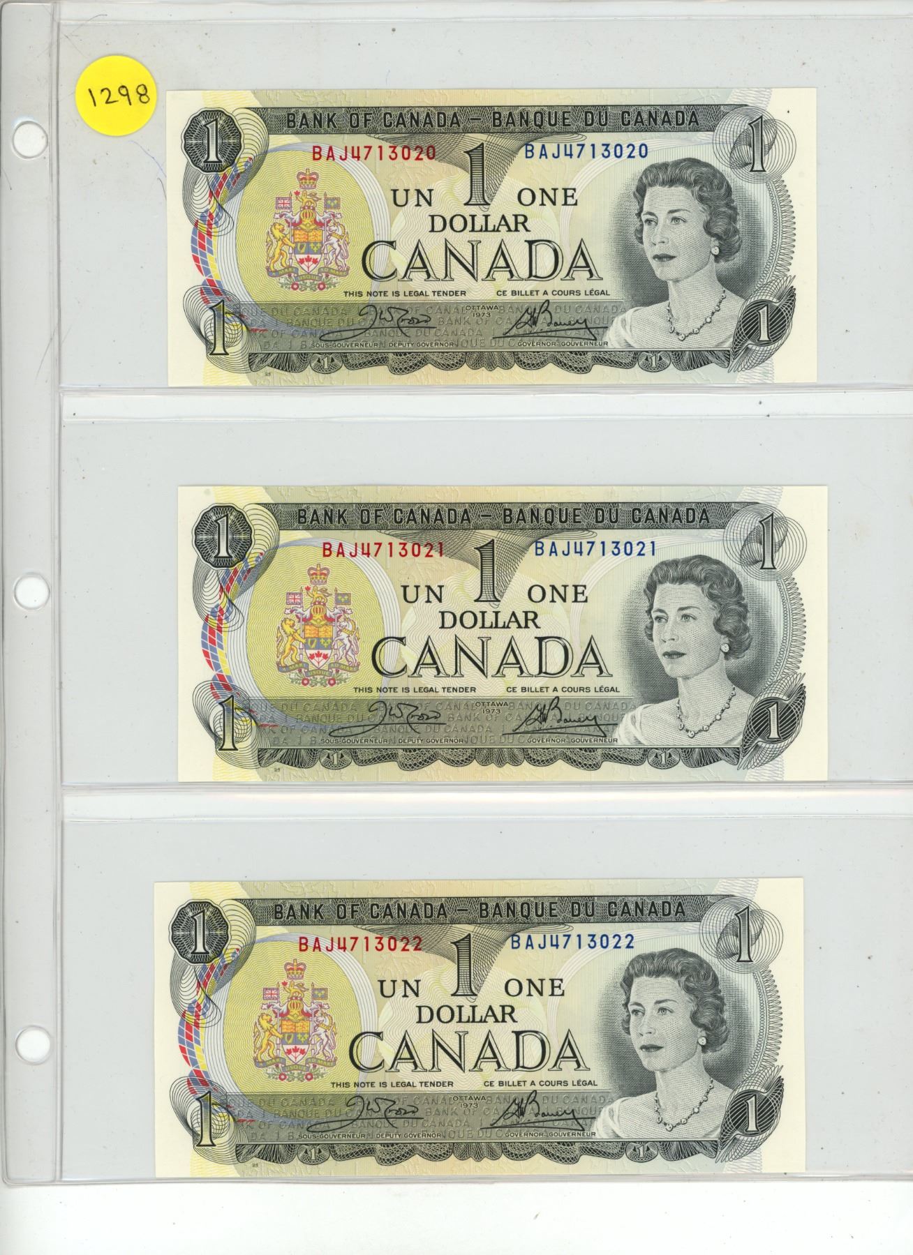 1973 Sheet of 3 Canadian One Dollar Bank Notes in Sequence.