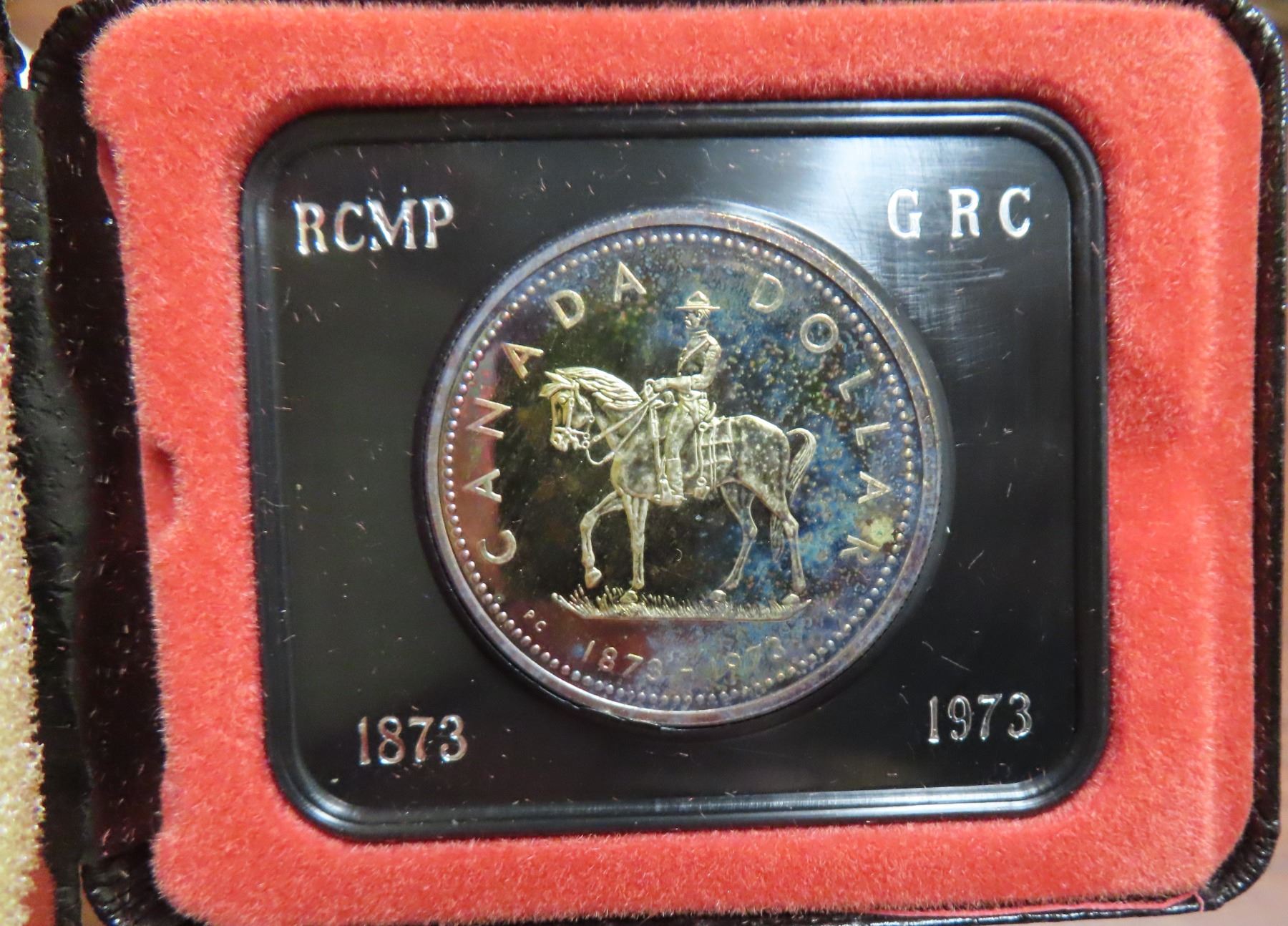 1973 Specimen Silver Dollar. Commemorates the 100th Anniversary of the founding of the RCMP. Housed in its original Royal Canadian Mint black clamshell case of issue. Beautifully Toned.
