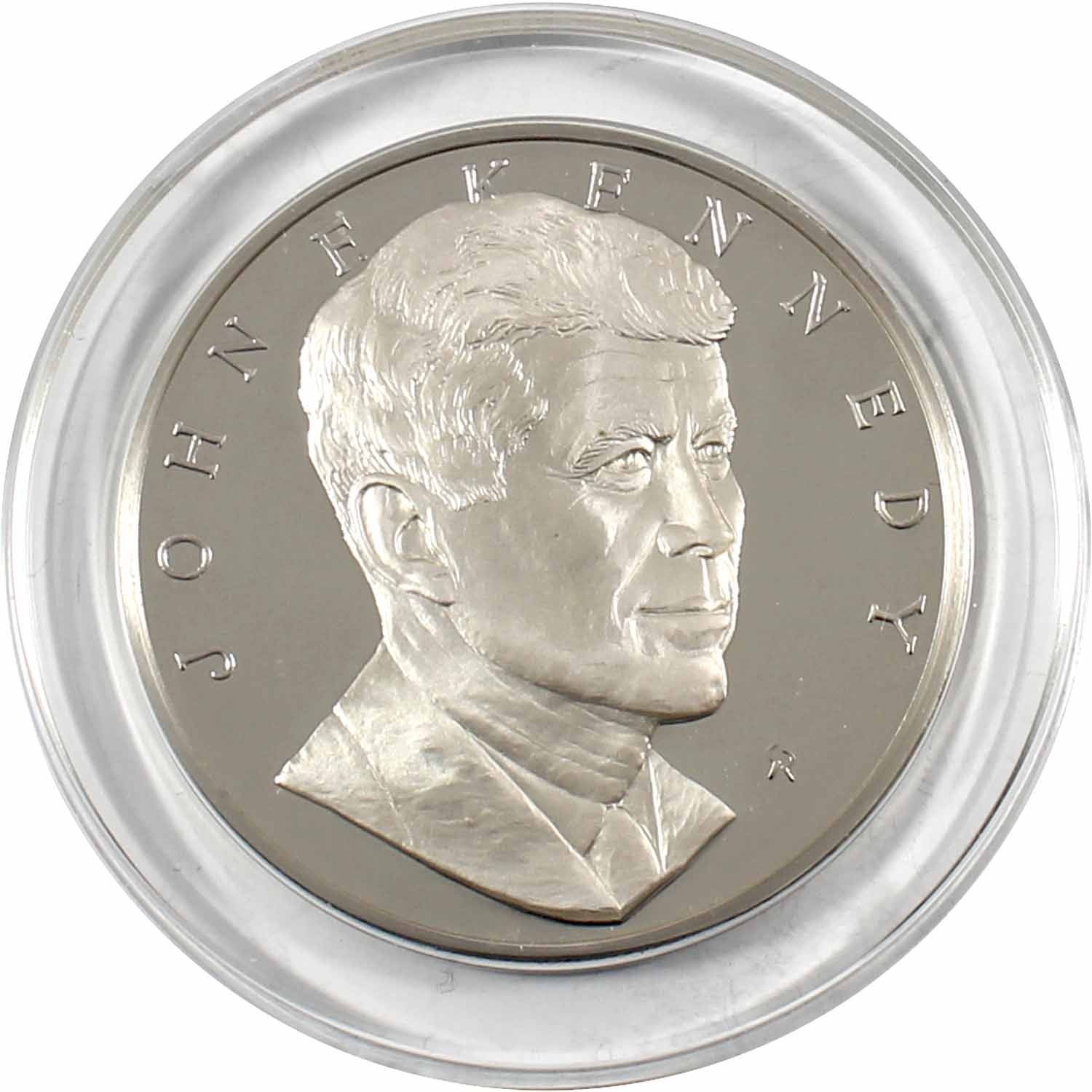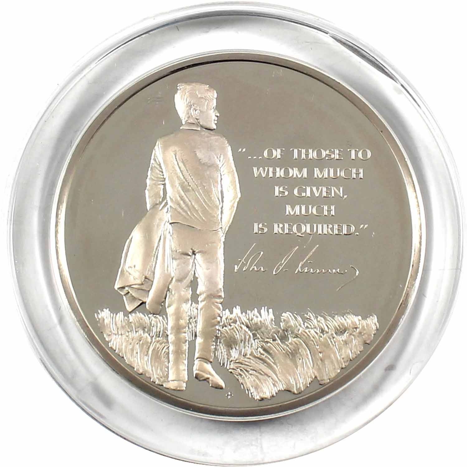 1973 The John F. Kenned Memorial Medal Minted by the Franklin Mint. Sculpted by Gilroy Roberts, this medal contains 1000 grains of Sterling Silver and comes in a capsule with a stand and COA (capsule lightly scratched). 1.93oz Fine Silver content.