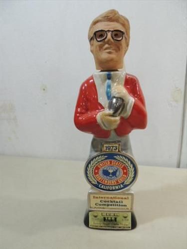 1973 VINTAGE JIM BEAM WHISKEY CERAMIC DECANTER: INTERNATIONAL COCKTAIL COMPETITION - BARTENDERS GUILD. AS SHOWN. VIEW PICTURE FOR DETAIL.
