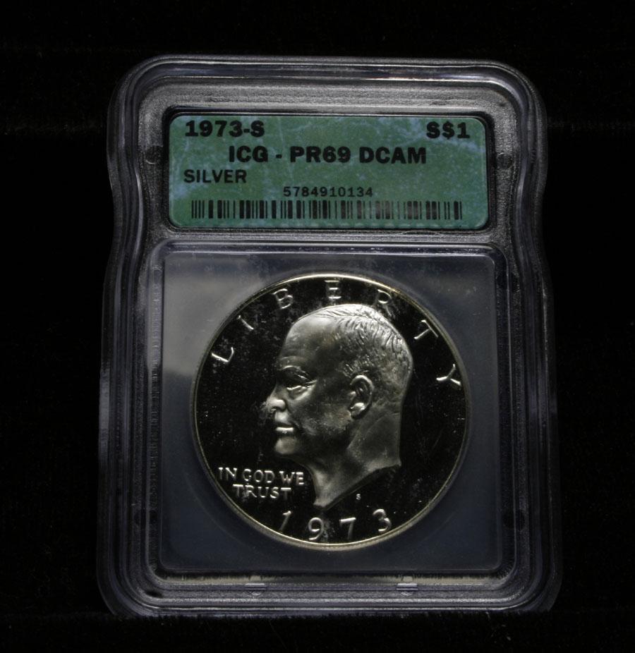 The 73 is the KEY Ike Dollar, Very Scarce Also Very Rare to get a "Brown Ike" in this condition, Vast Majority as you may have seen are foggy and partially "Damaged". This is a beautiful Example of this Silver Proof Issue. PCGS Lists an PR70 DCAM at $12,500 and the last PR69 DCAM that sold and was Recorded was in May of 2010 and it sold online in a Heritage auction for $138, plus their 20% Premium. This coin is Fantastic. Estimated Value $135