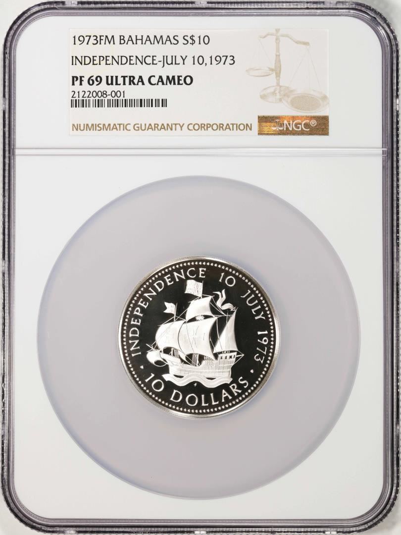 One 1973FM Bahamas $10 Proof Independence Silver Coin NGC PF69 Ultra Cameo. NGC Certified.
