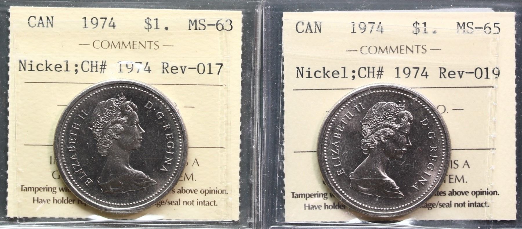 1974 $1 CH#1974-Rev-017 Choice Mint State-63, 1974 $1 CH#1974-Rev-019 Gem Mint State-65, Both coins ICCS graded.