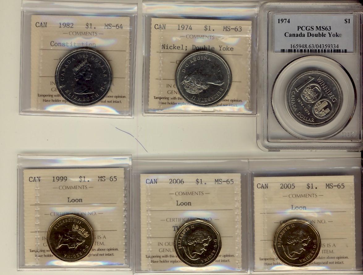 1974 $1 Dbl Yoke ICCS & PCGS MS63. Also includes 1982 Constitution MS64, 1999, 2005 & 2006 Loon dollars MS65. & Lot of 2 coins.