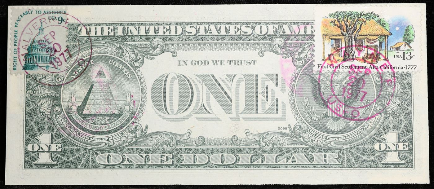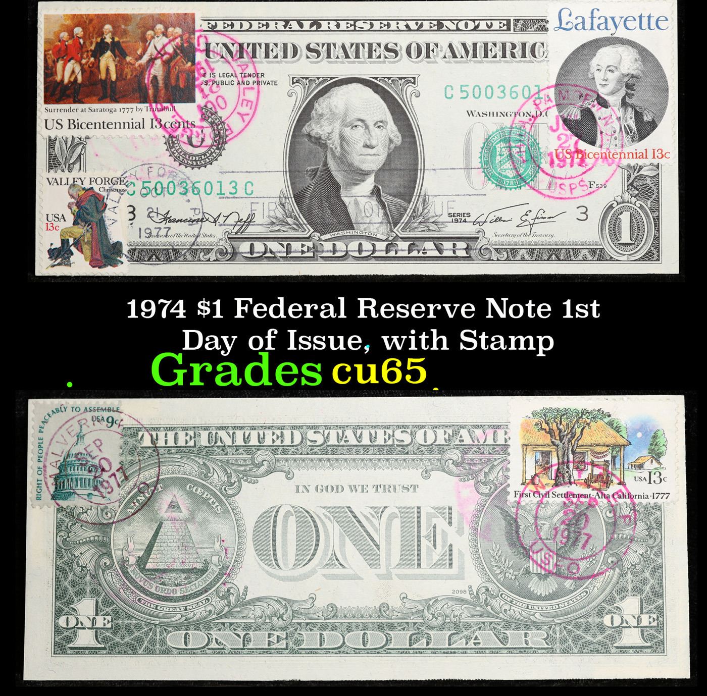 1974 $1 Federal Reserve Note 1st Day of Issue, with Stamp Grades Gem CU.