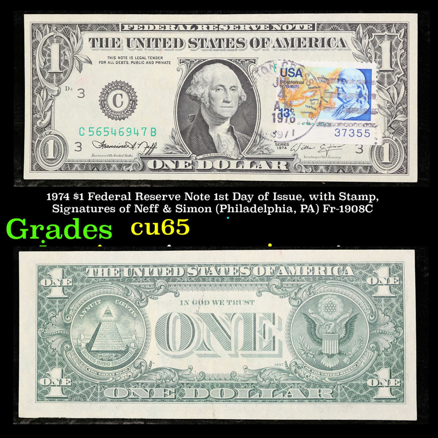 1974 $1 Federal Reserve Note 1st Day of Issue, with Stamp, Signatures of Neff & Simon (Philadelphia, PA) Fr-1908C Grades Gem CU.