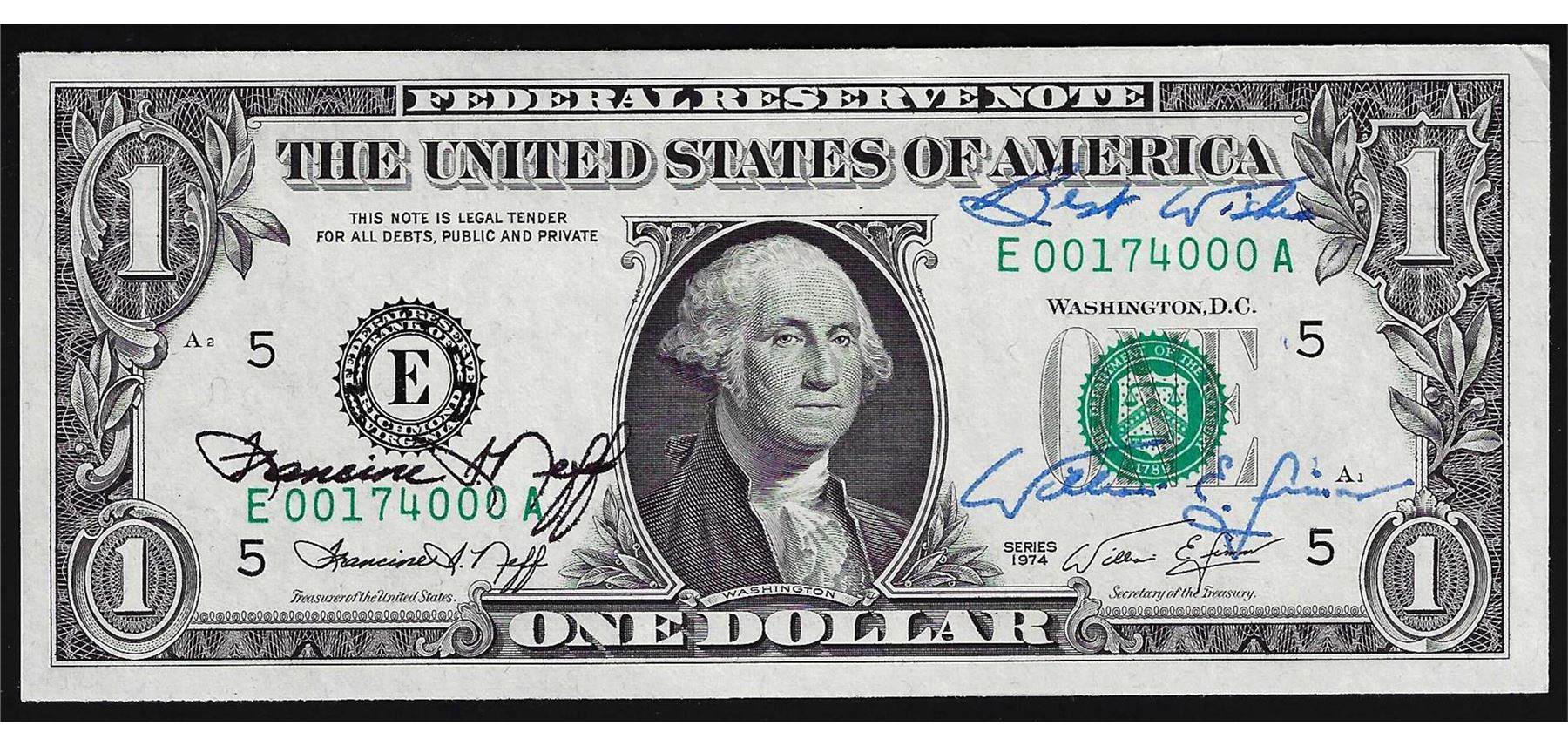 One 1974 $1 Federal Reserve Note Dual Courtesy Autographs.