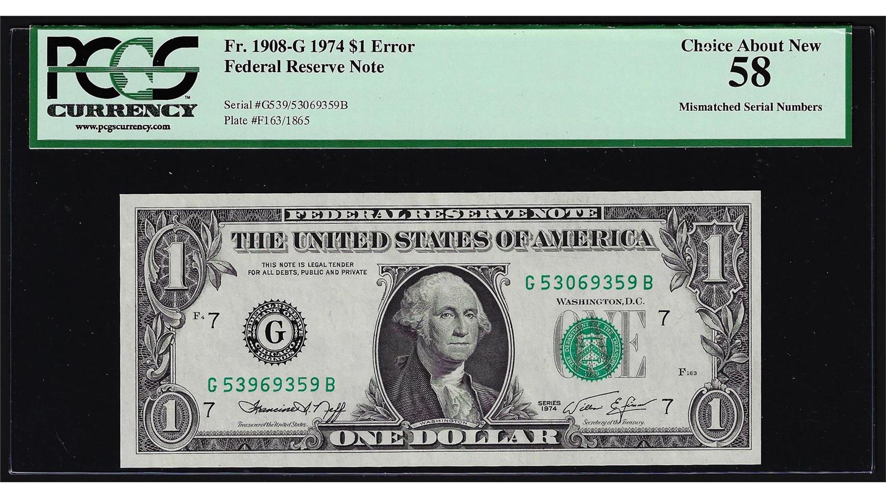 One 1974 $1 Federal Reserve Note Mismatched Serial Number ERROR PCGS Choice AU58. PCGS Graded.