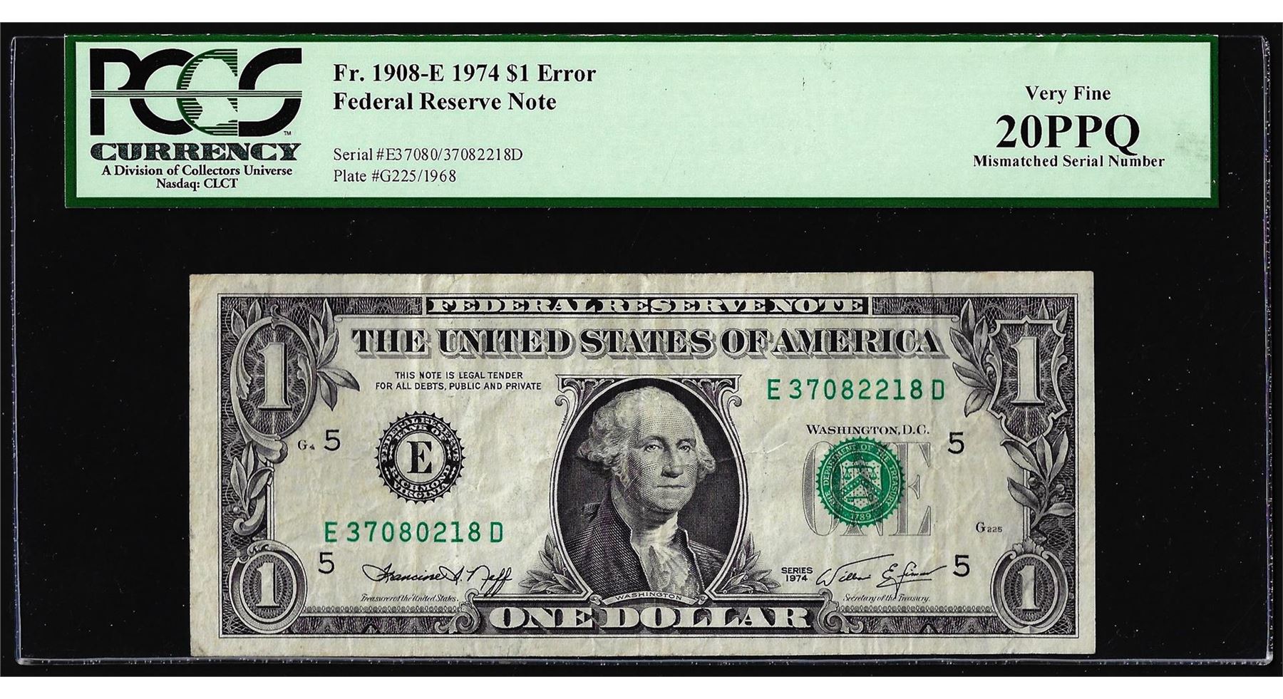 One 1974 $1 Federal Reserve Note Mismatched Serial Number ERROR PCGS Very Fine 20PPQ. PCGS Graded.