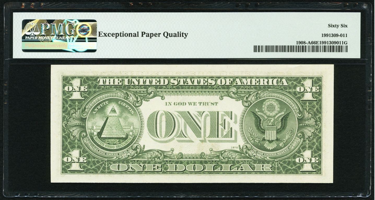 One 1974 $1 Radar Serial Boston Federal Reserve Note PMG 66EPQ.