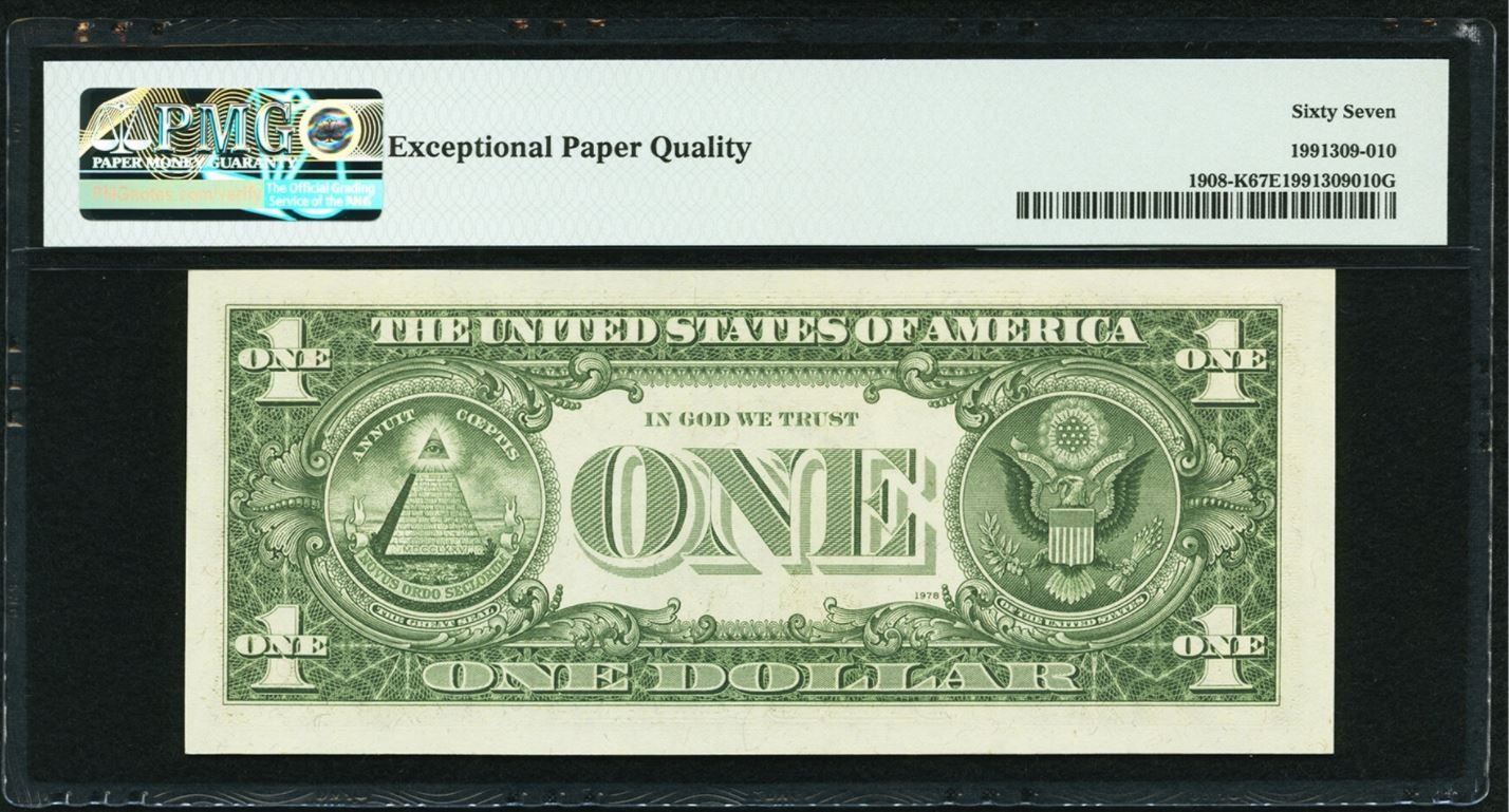 One 1974 $1 Radar Serial Dallas Federal Reserve Note PMG 67EPQ.