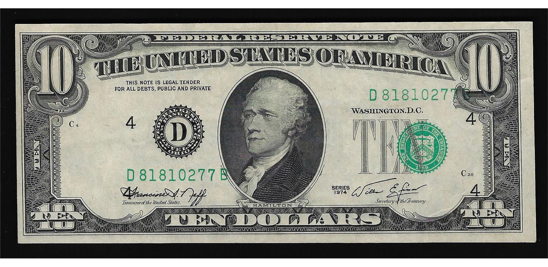 One 1974 $10 Federal Reserve Note Misalignment ERROR.