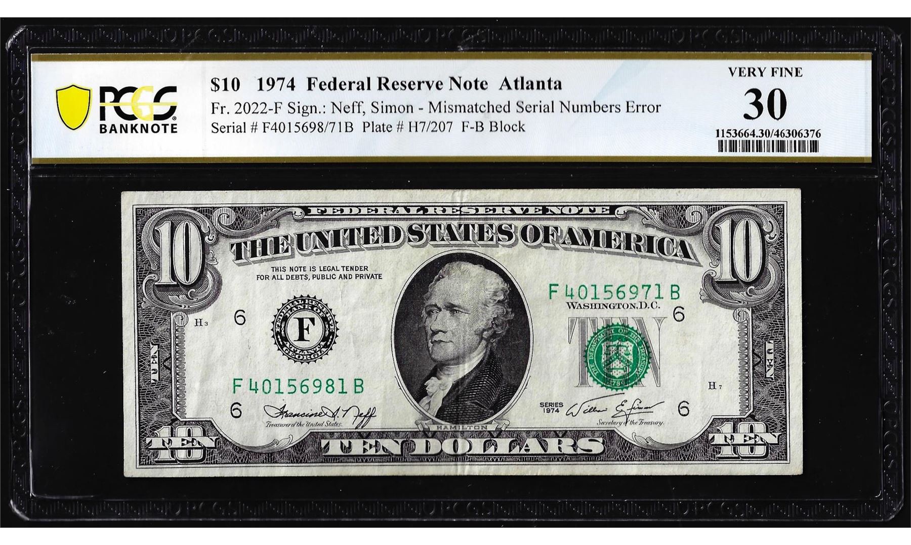 One 1974 $10 Federal Reserve Note Mismatched Serial Number Error Fr.2022-F PCGS Very Fine 30. PCGS Graded.