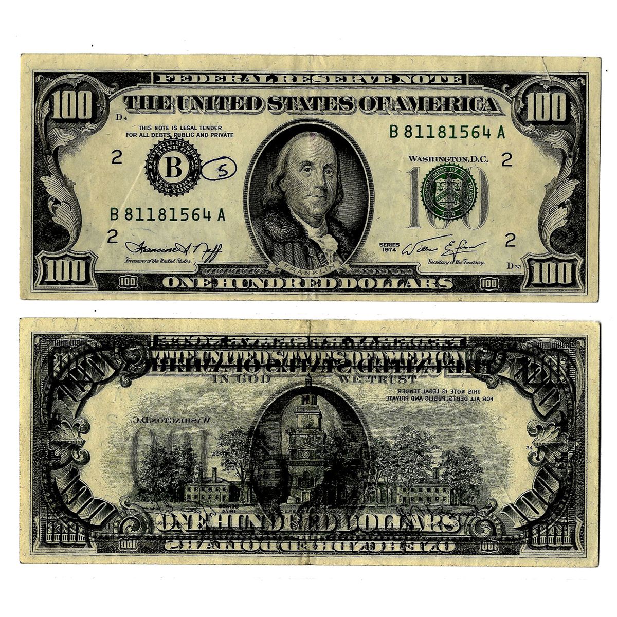 $100 Federal Reserve Error Note -- Series 1974, New York -- Full Face to Back Ink Offfset -- Edge Tear at Top Right -- Graded PCGS 35
