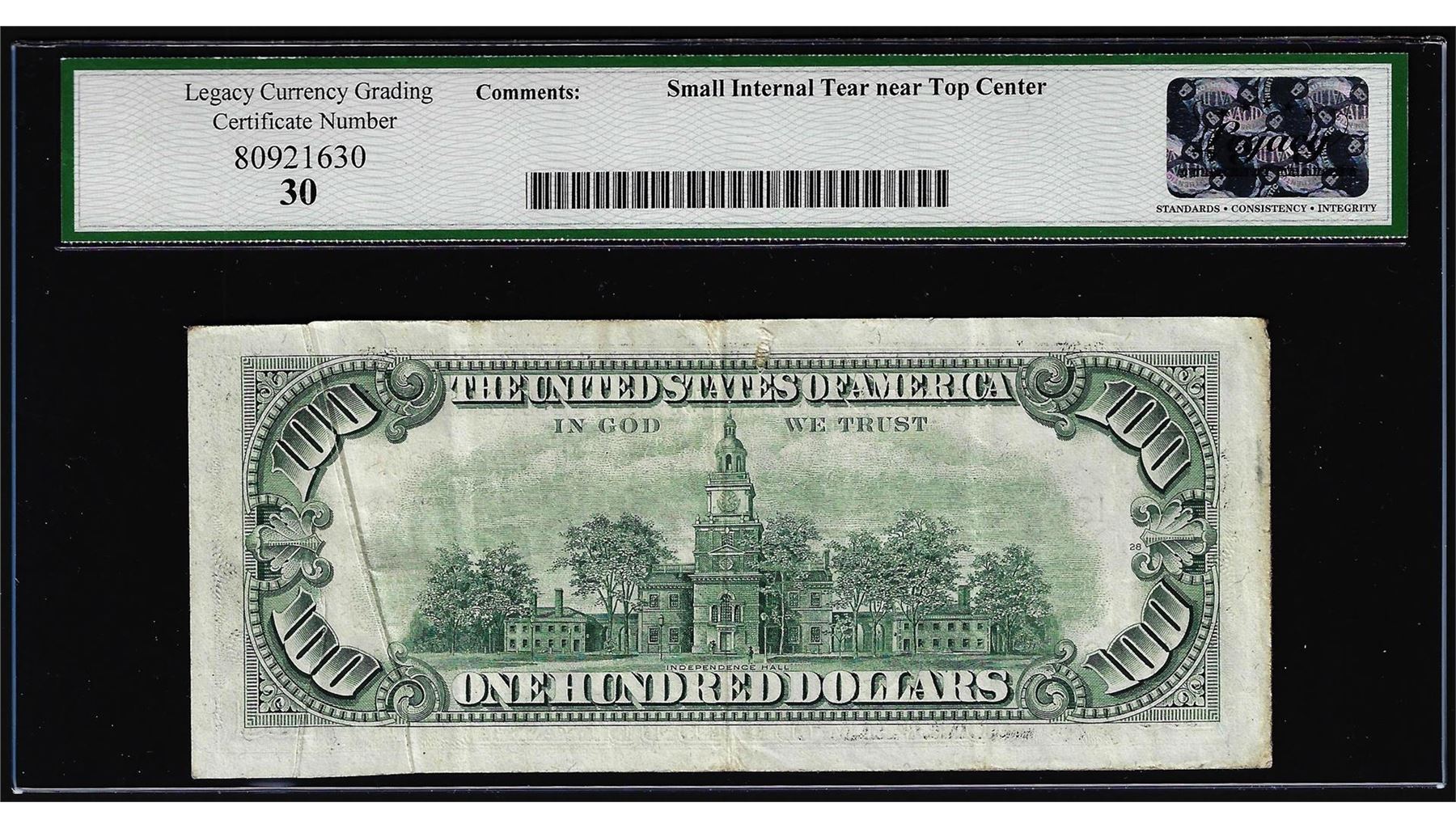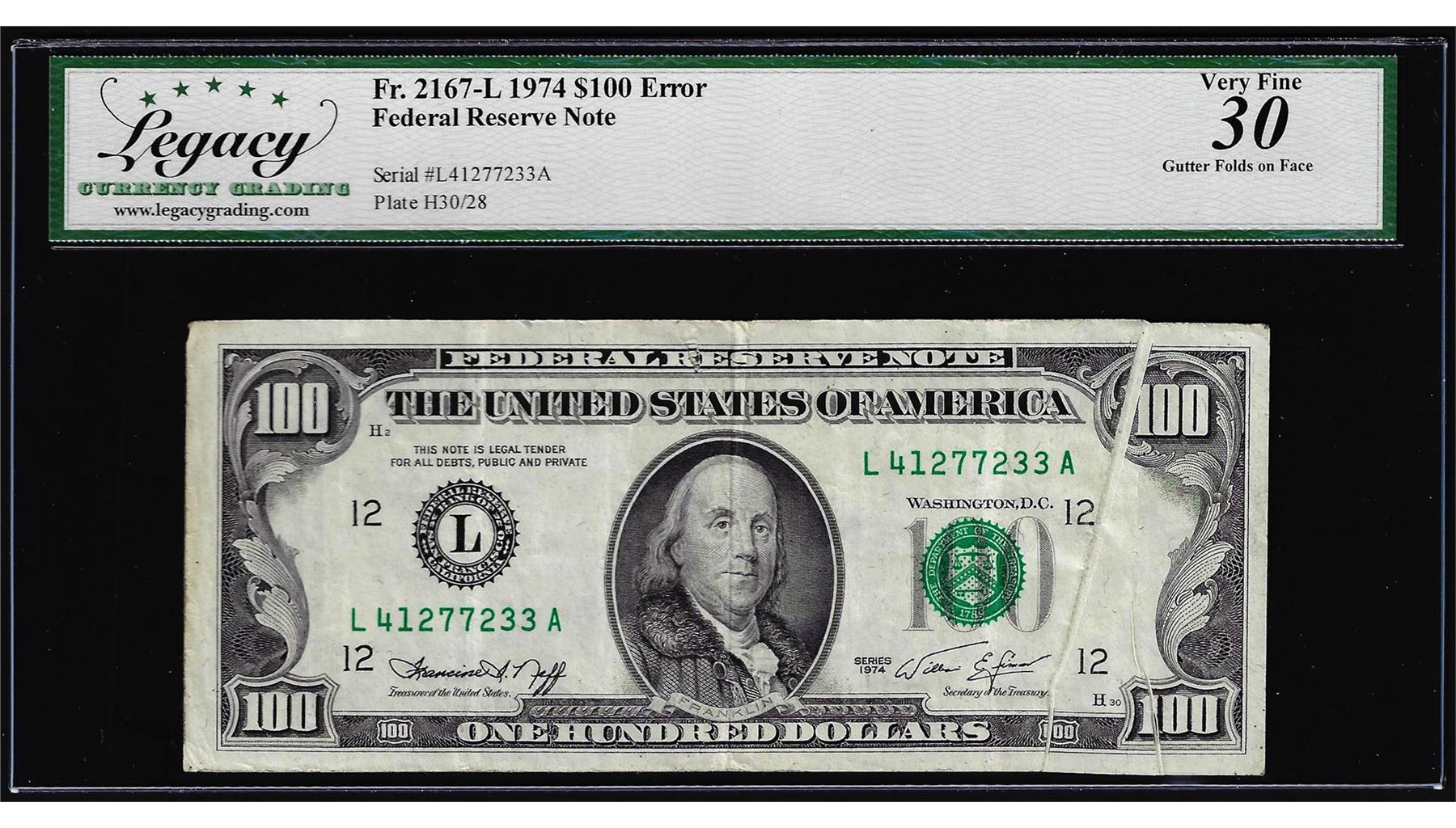 One 1974 $100 Federal Reserve Note Fr.2167L Gutter Folds Error Legacy Very Fine 30 . Legacy Graded.