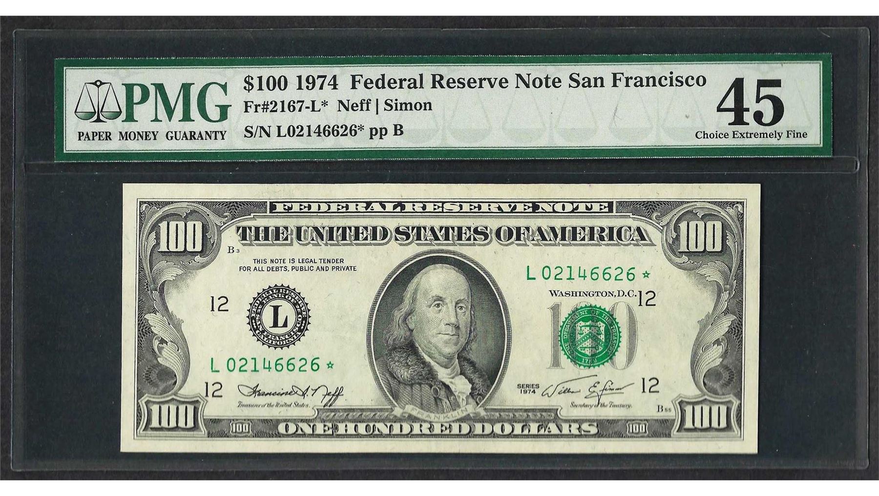 1974 $100 Federal Reserve STAR Note San Francisco PMG Choice Extremely Fine 45