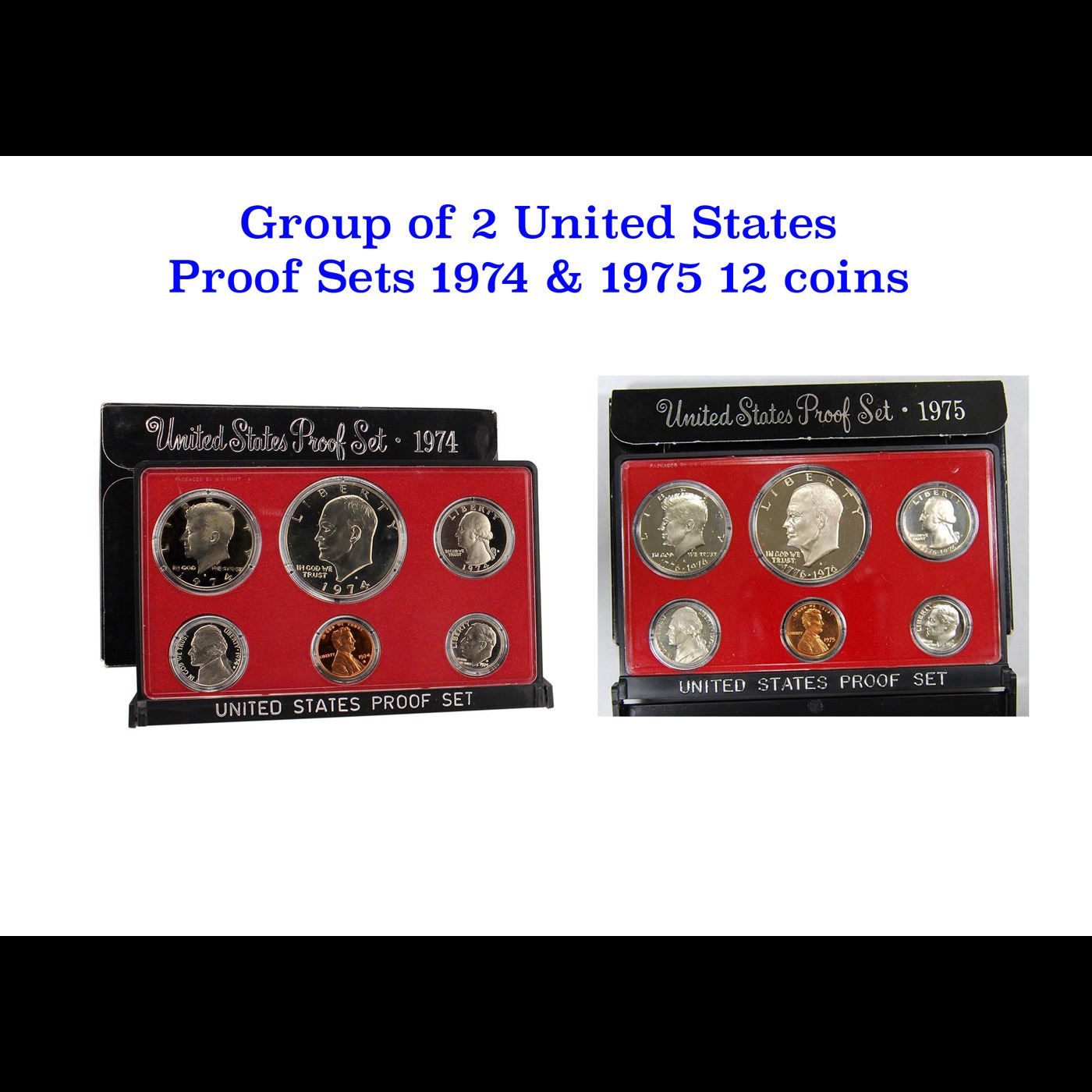 1974 & 1975 United Stated Mint Proof Set In Original Government Packaging. The 1974 Proof Set Includes 6 Proof Coins Including the Eisenhower Proof Dollar. The 1975 Proof Set Includes 6 Cameo Proof Coins Including the Proof Bicentennial Washington Quarter, The Proof Bicentennial Kennedy Half Dollar and of course the Bicentennial Proof Eisenhower Dollar. Great Set! The Bicentennial coins were included in the 1975 and 1976 Proof Sets. A great PQ proof set.