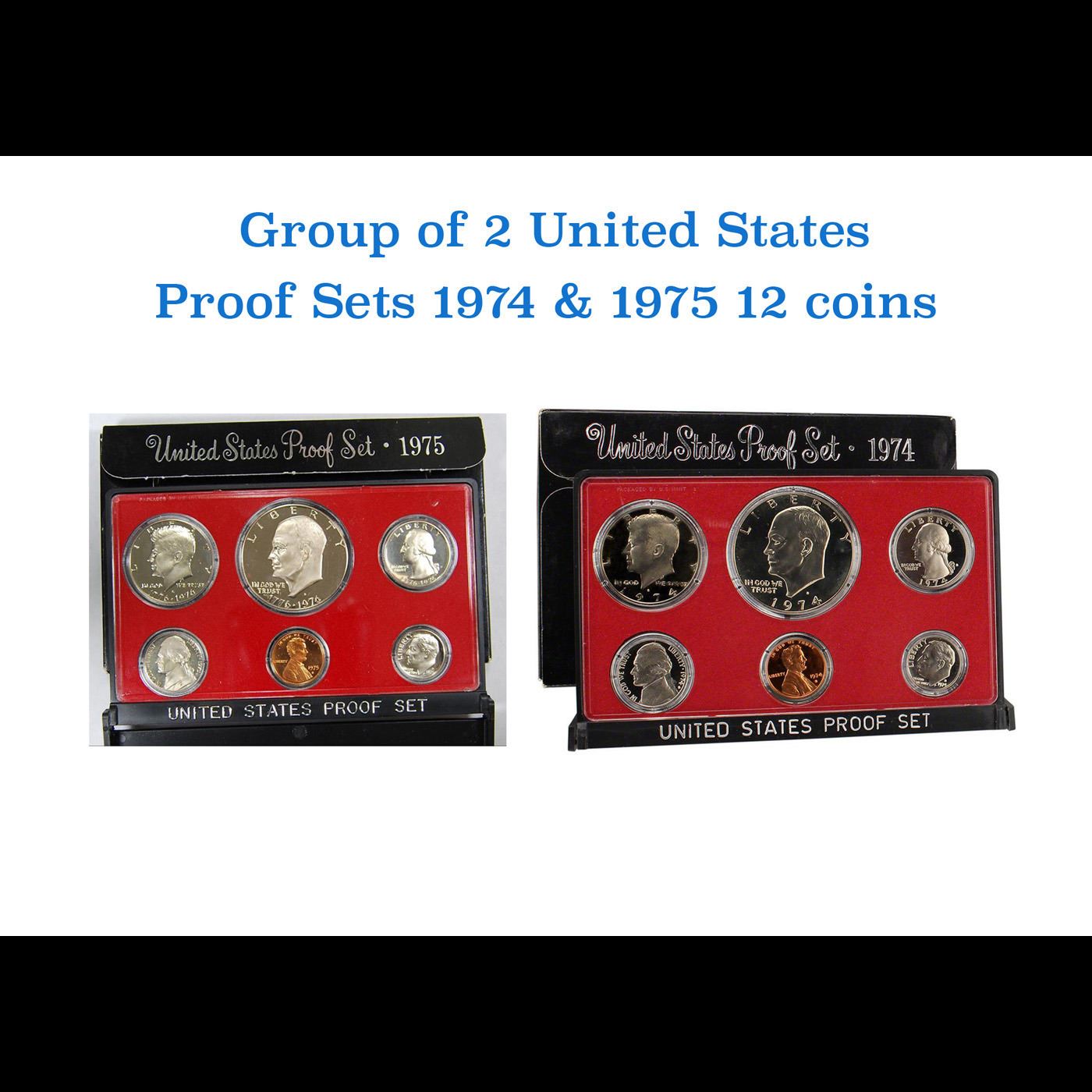 1974 & 1975 United Stated Mint Proof Set In Original Government Packaging. The 1974 Proof Set Includes 6 Proof Coins Including the Eisenhower Proof Dollar. The 1975 Proof Set Includes 6 Cameo Proof Coins Including the Proof Bicentennial Washington Quarter, The Proof Bicentennial Kennedy Half Dollar and of course the Bicentennial Proof Eisenhower Dollar. Great Set! The Bicentennial coins were included in the 1975 and 1976 Proof Sets. A great PQ proof set.