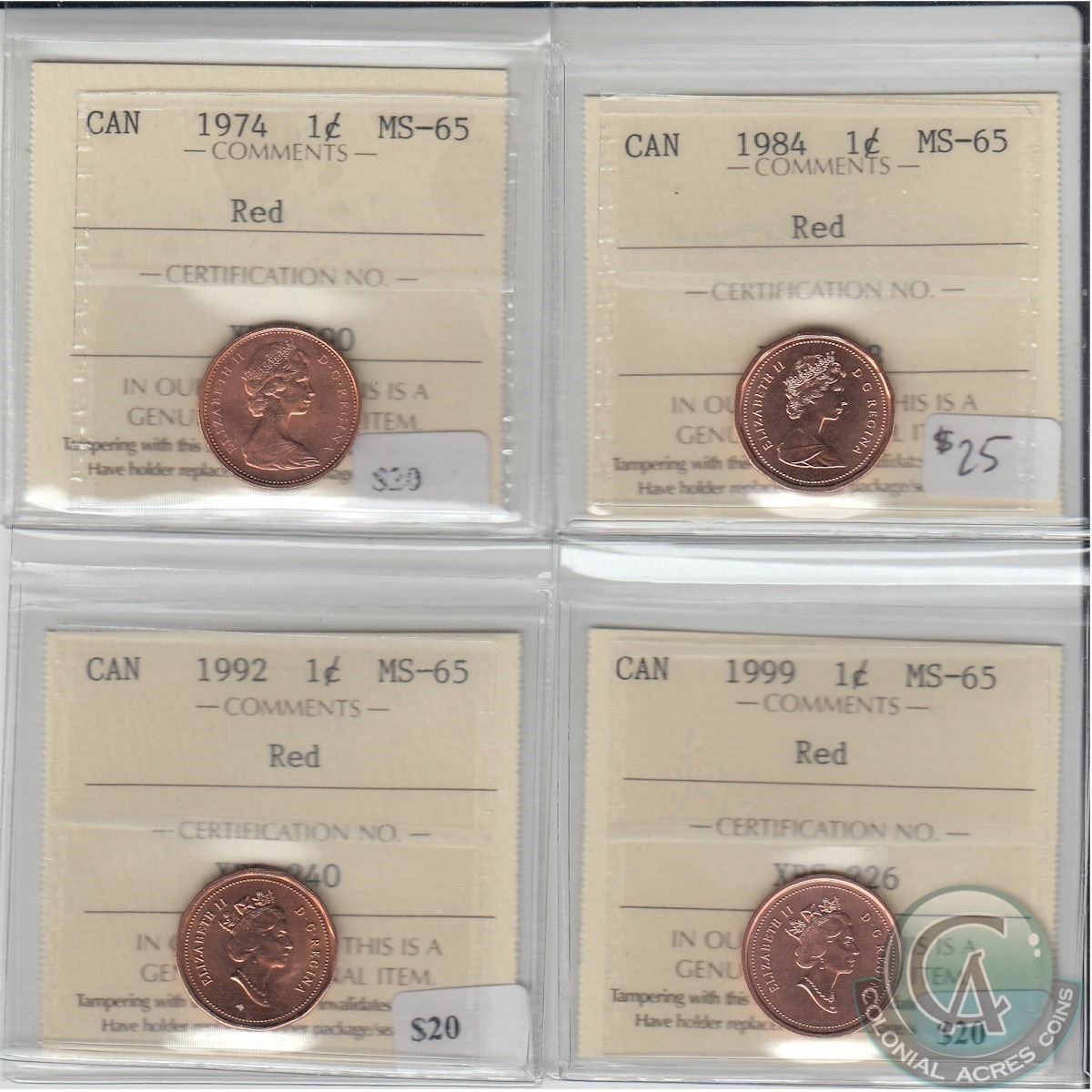 1974, 1984, 1992 and 1999 Canada 1-cent All ICCS Certified MS-65 (4pcs)