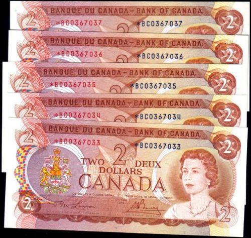 1974 Two Dollars Lawson-Bouey, BC-47aA, five consecutive serial numbers *BC0367033 to *BC0367037, all Uncirculated