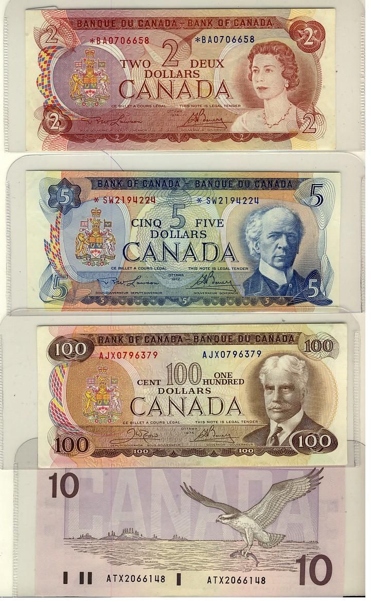 1974 $2 BC-47aA #*BA0706658, 1972 $5 BC-48bA #*SW2194224, 1975 $100 BC-52bA #*AJX0796379 & 1989 $10 BC-57aA #*ATX2066148. Lot of 4 replacment notes VF to AU.