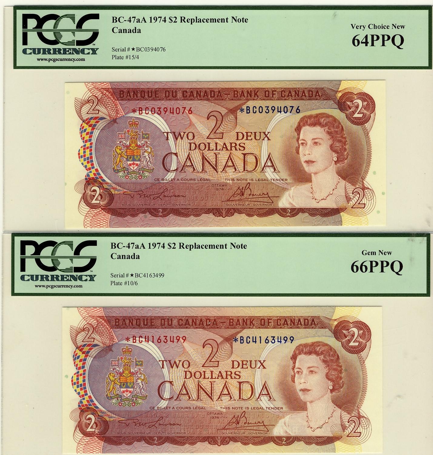 1974 $2 BC-47aA #*BC0394076 CH UNC 64PPQ & *BC4163499 Gem UNC 66PPQ.