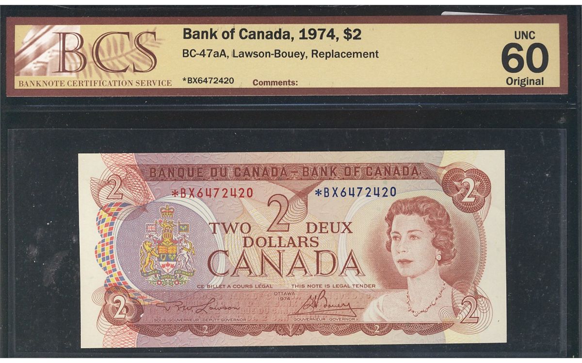 1974 $2 BC-47aA #*BX6472420 BCS UNC60,”.