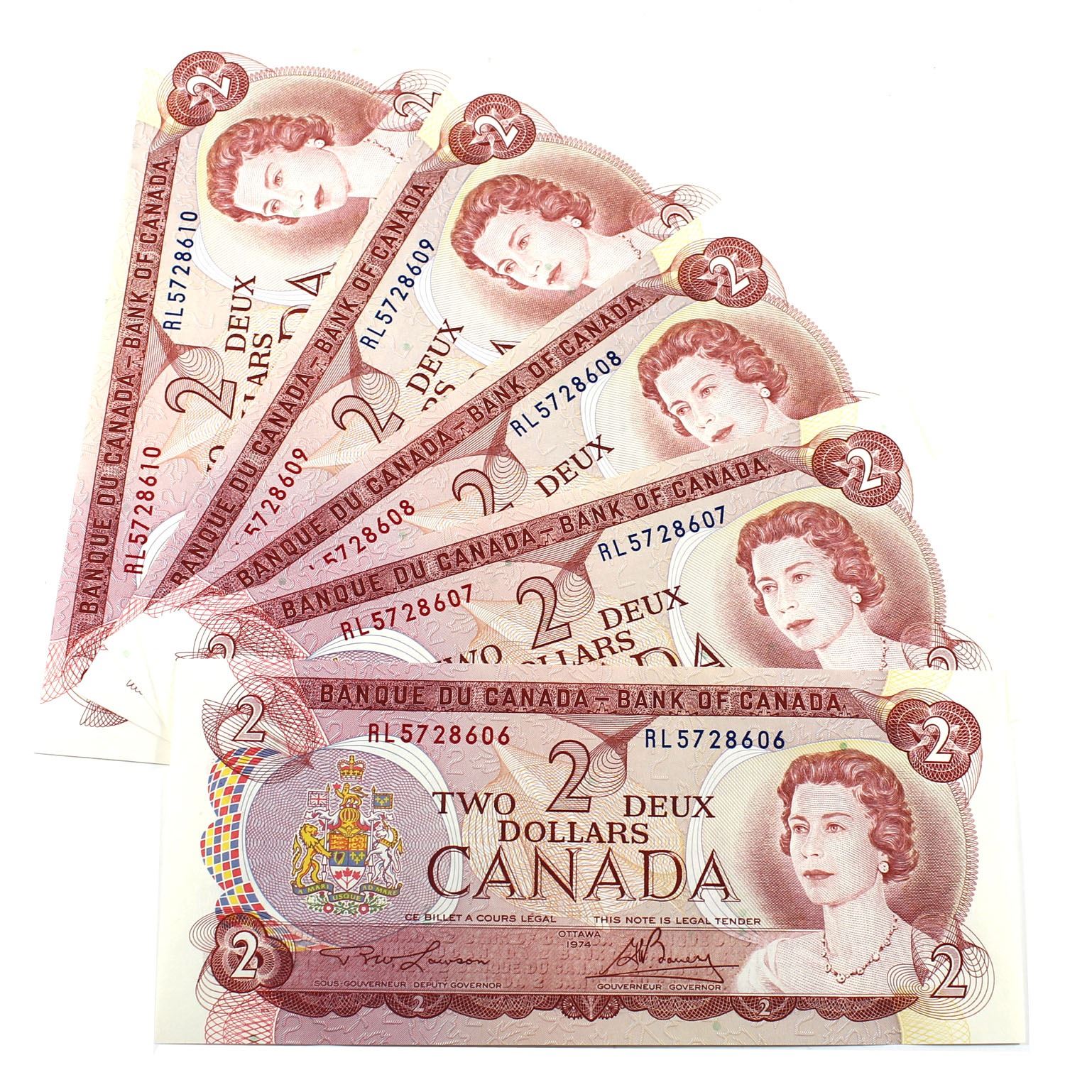 1974 $2 Bank of Canada Lawson-Bouey Signature Notes with Consecutive Serial Numbers RL5728606-10. 5pcs