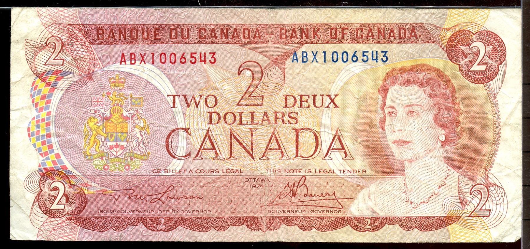 1974 $2 Bc-47aA-i #ABX1006543, in average grade.