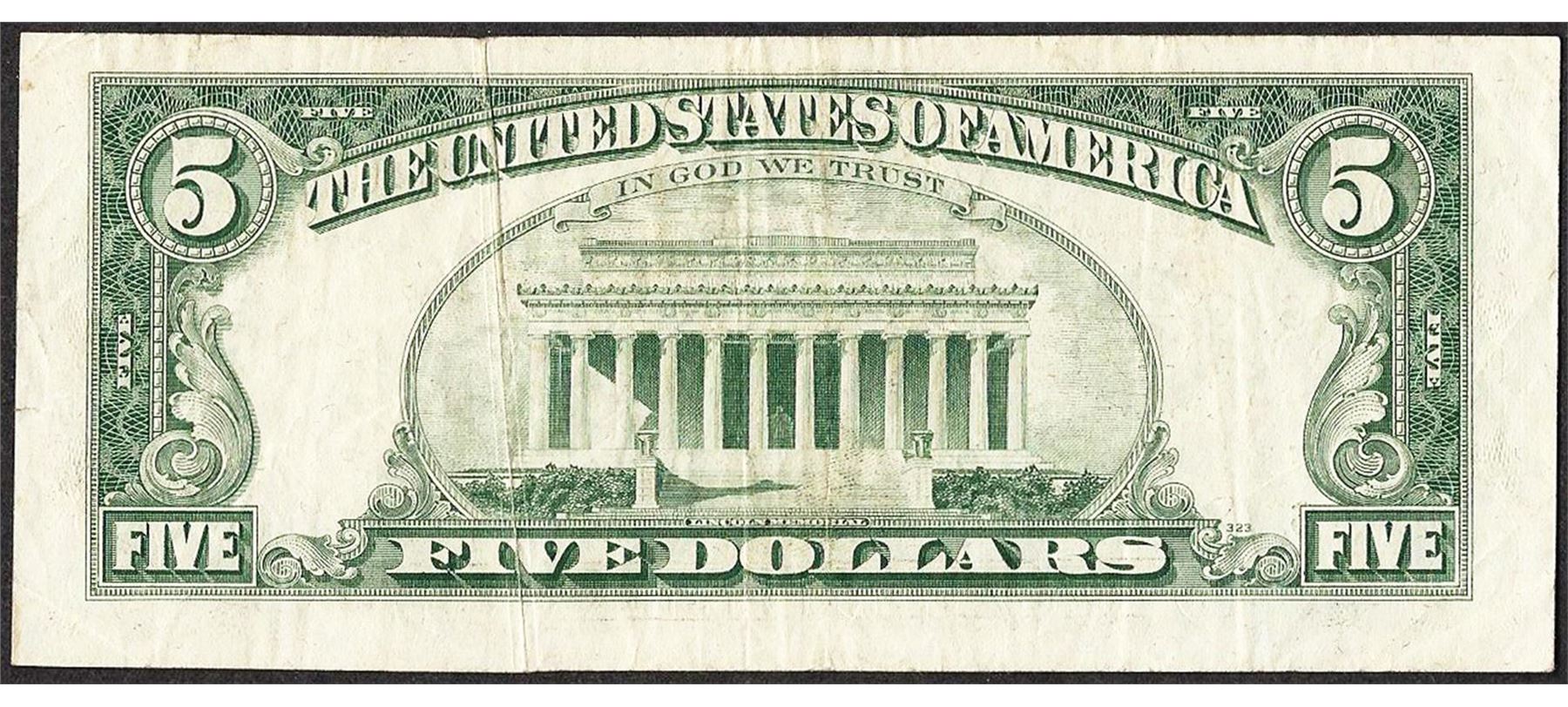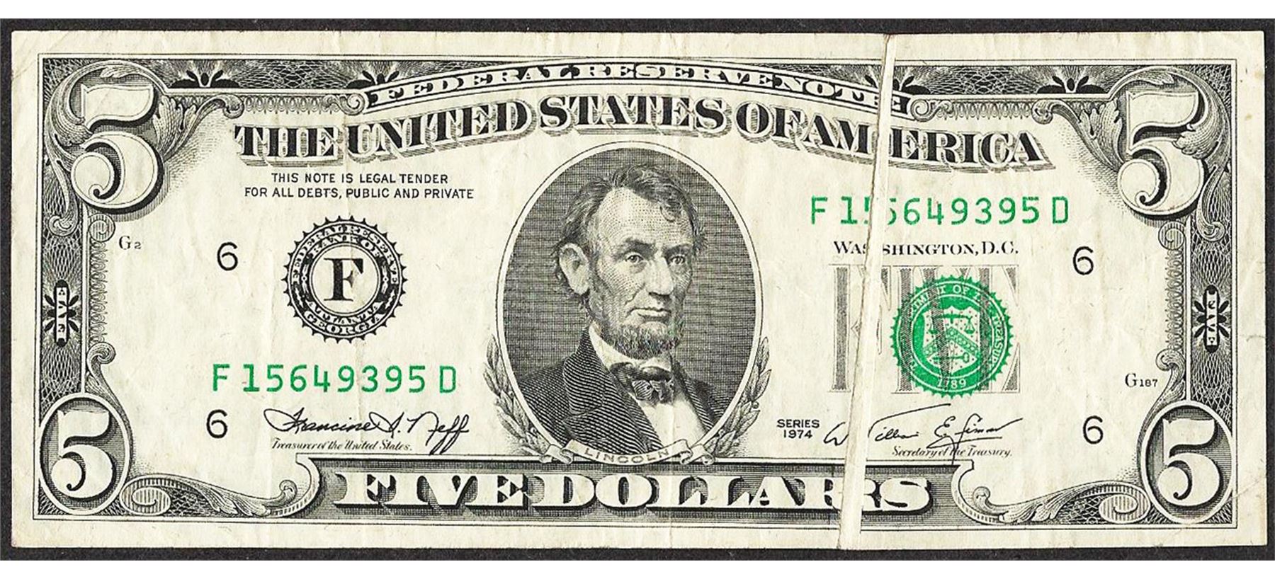 One 1974 $5 Federal Reserve Note Gutter Fold ERROR Note.
