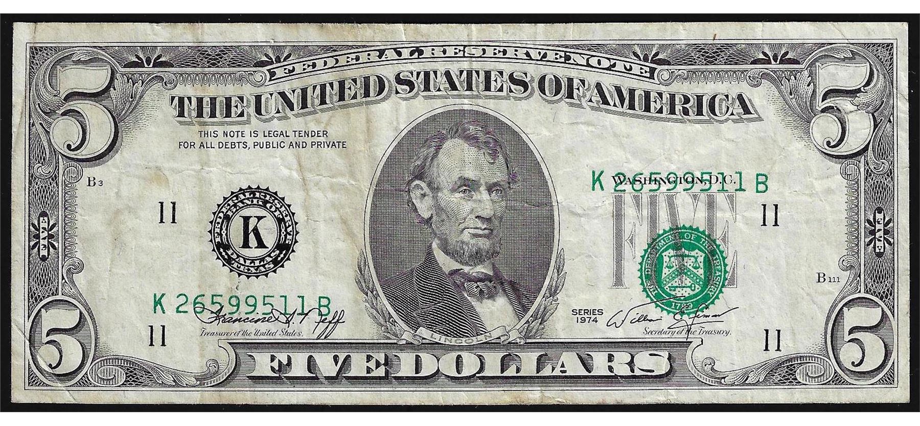 One 1974 $5 Federal Reserve Note Misaligned Overprint ERROR.