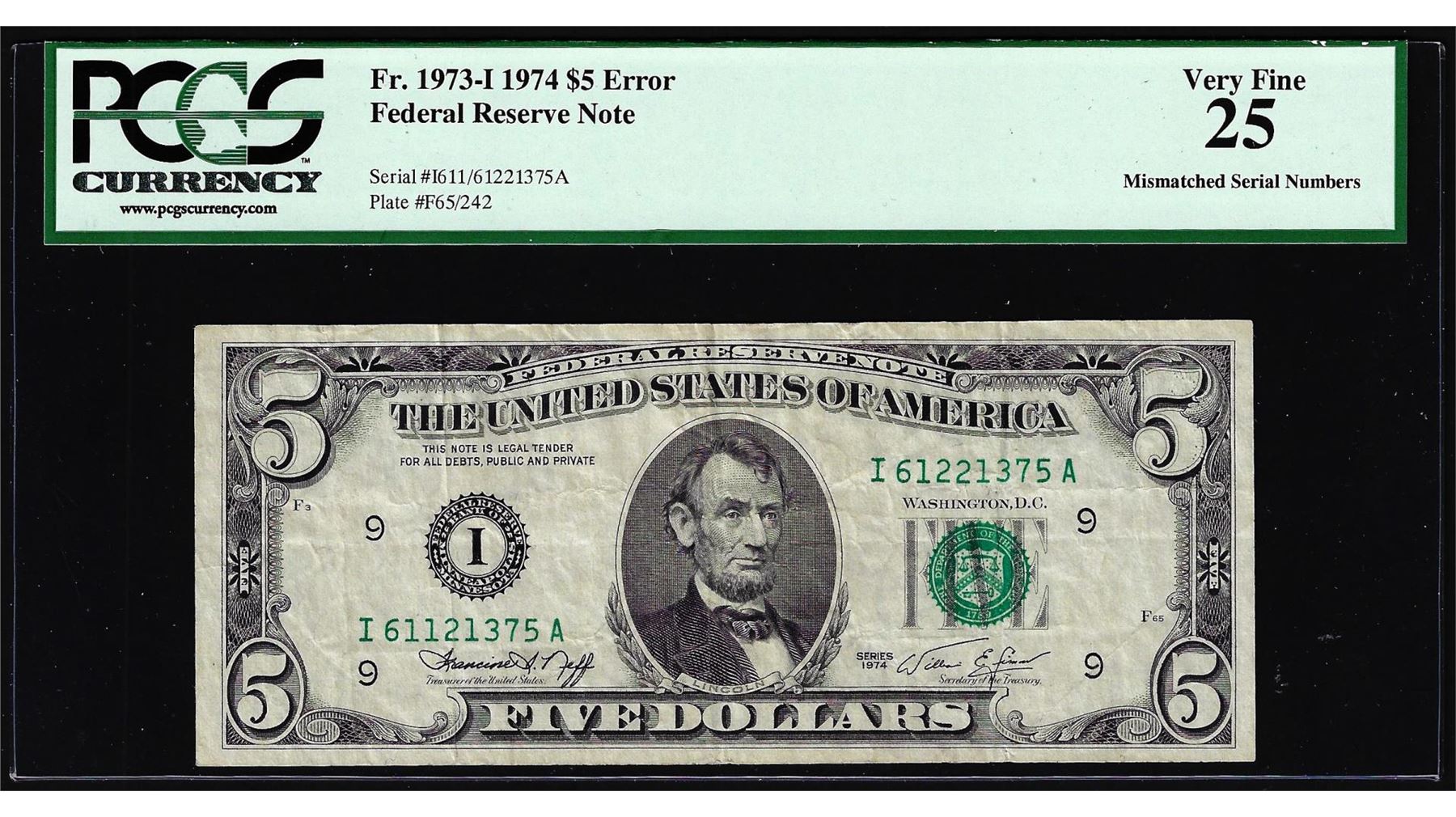 One 1974 $5 Federal Reserve Note Mismatched Serial Number Error Fr.1973-I PCGS Very Fine 25. PCGS Graded.
