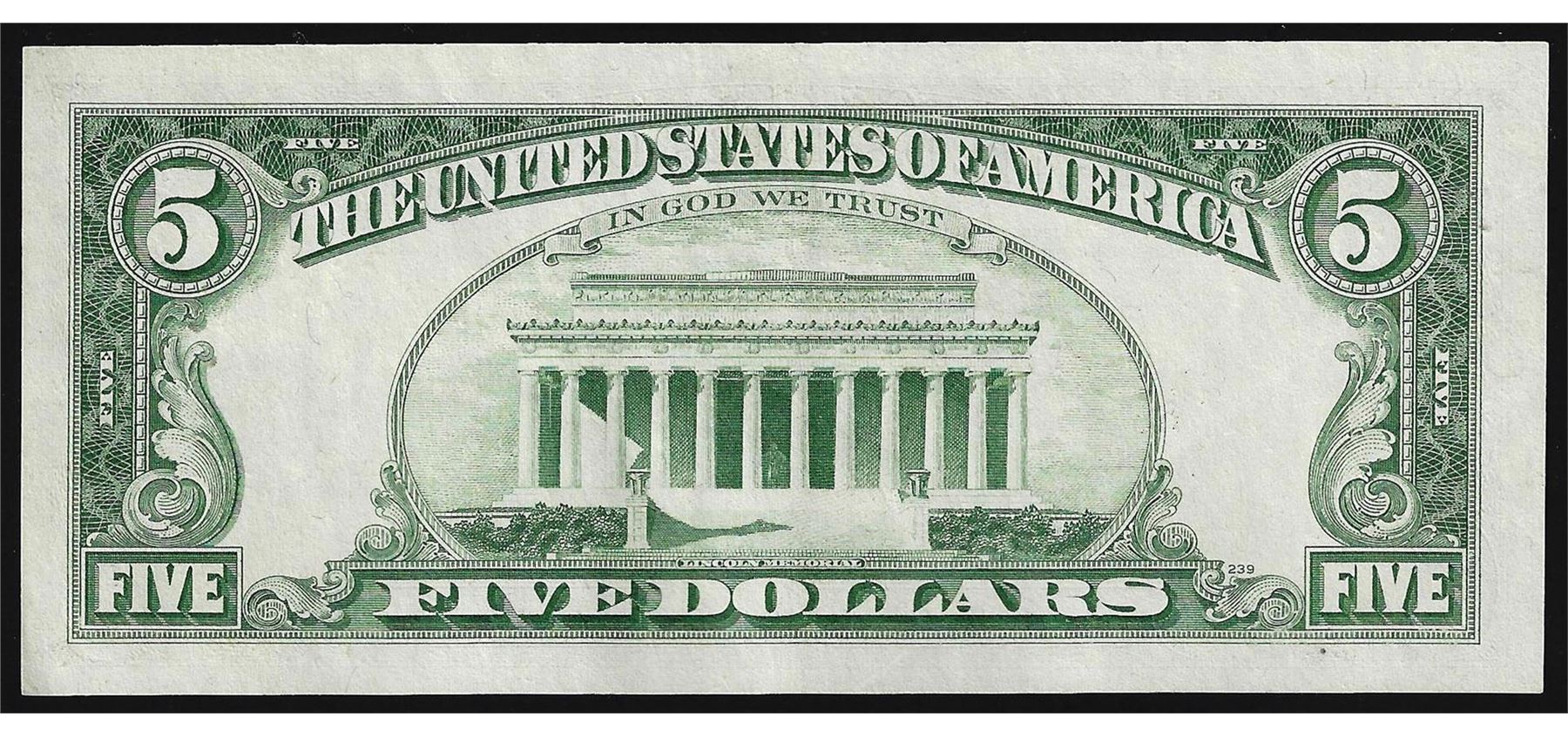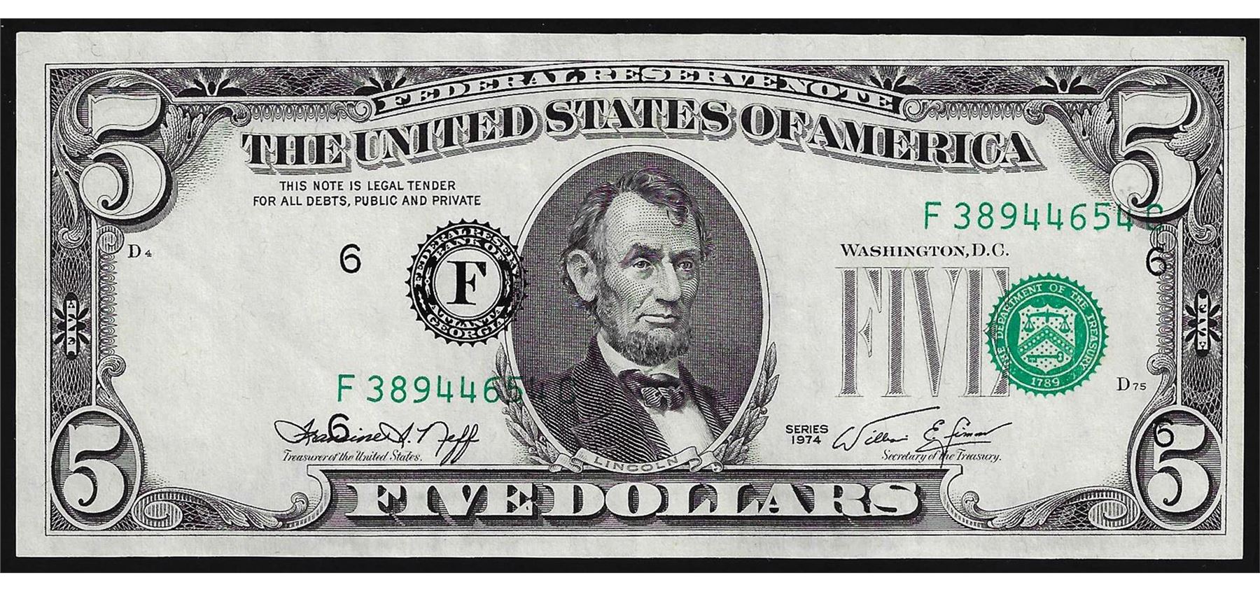 One 1974 $5 Federal Reserve Note Offset Printing ERROR.