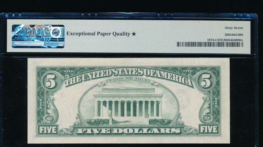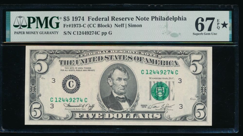 One 1974 $5 Philadelphia FRN PMG 67EPQ.